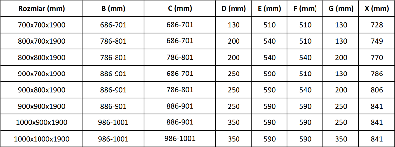 Tuš kabine, vrata in stene so standardno prilagojene za montažo na tuš kadi določenih dimenzij. Te dimenzije so navedene v imenu ali opisu izdelka. Vendar je treba upoštevati, da se dejanske mere elementov lahko nekoliko razlikujejo od nazivnih vrednosti. V primeru načrtovane montaže neposredno na tla je priporočljivo natančno preveriti zunanje mere in razporeditev elementov v skladu s tehnično risbo.