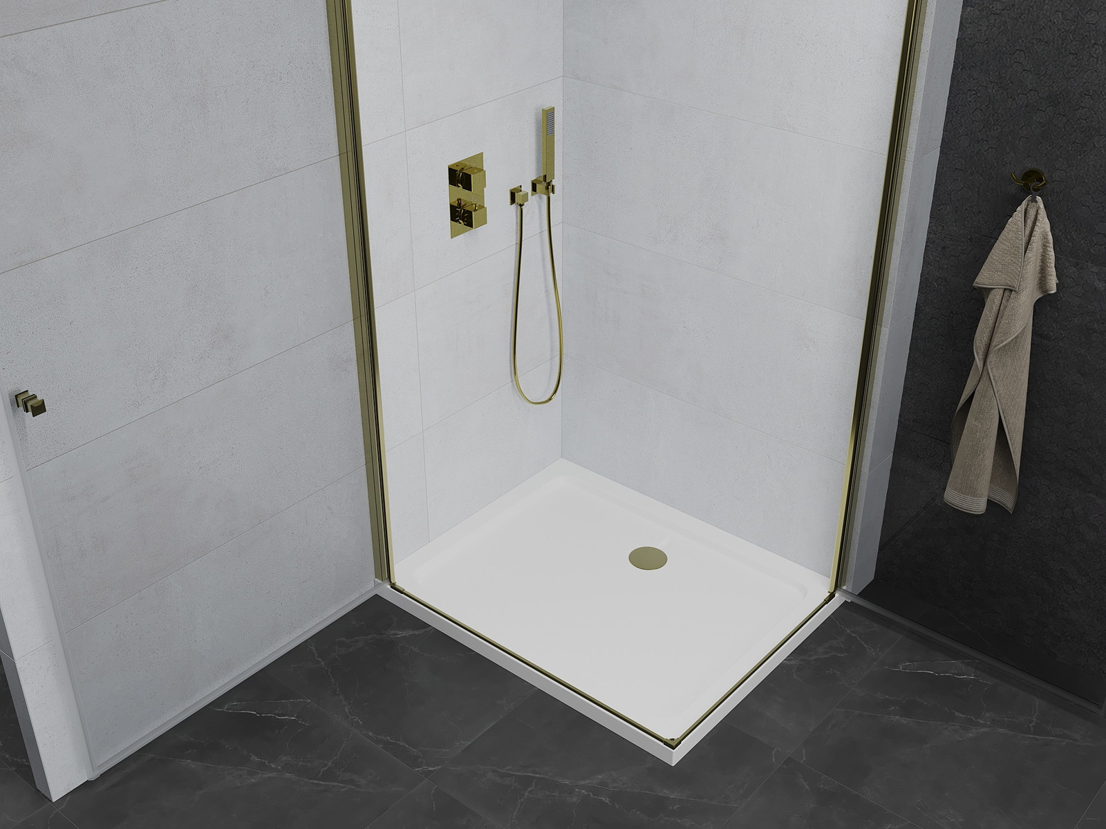Mexen Pretoria Duo nagibna tuš kabina 90 x 80 cm, prozorna, zlata + pladenj Flat - 852-090-080-50-02-4010G