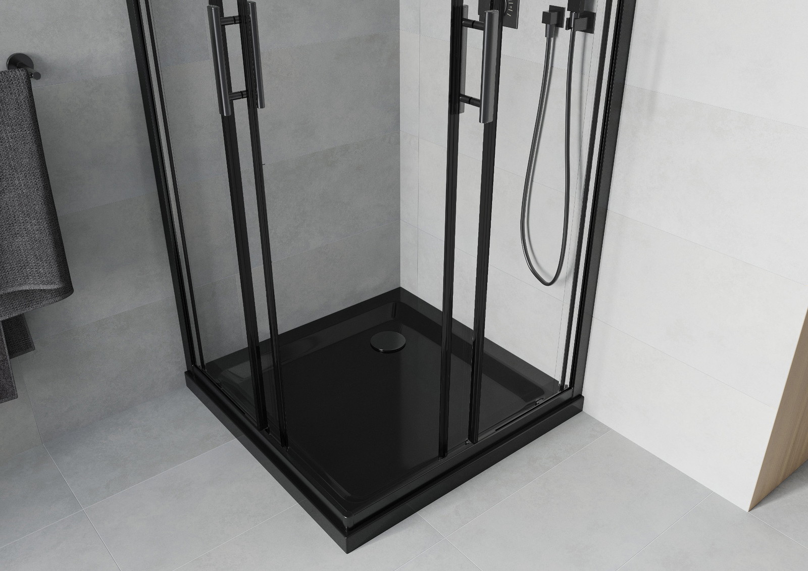 Mexen Rio kvadratna tuš kabina 80 x 80 cm je eleganten in funkcionalen izbor za vsako kopalnico. Prozorno, kaljeno steklo debeline 6 mm, črn zaključek in aluminijast profil dodajajo sodobnost. Univerzalnost montaže in drsna vrata olajšajo namestitev. Premaz za lažje čiščenje ter komplet tesnil zagotavljata udobje uporabe. Črna tuš kad Flat debeline 5 cm izdelana iz sanitarnega akrila ponuja trpežnost in stil. V kompletu sta sifon ter kovinski ročaj. Izdelek se popolnoma prilagaja vsakemu prostoru, zahvaljujoč regulaciji širine in možnosti montaže na ploščice ali tuš kad.