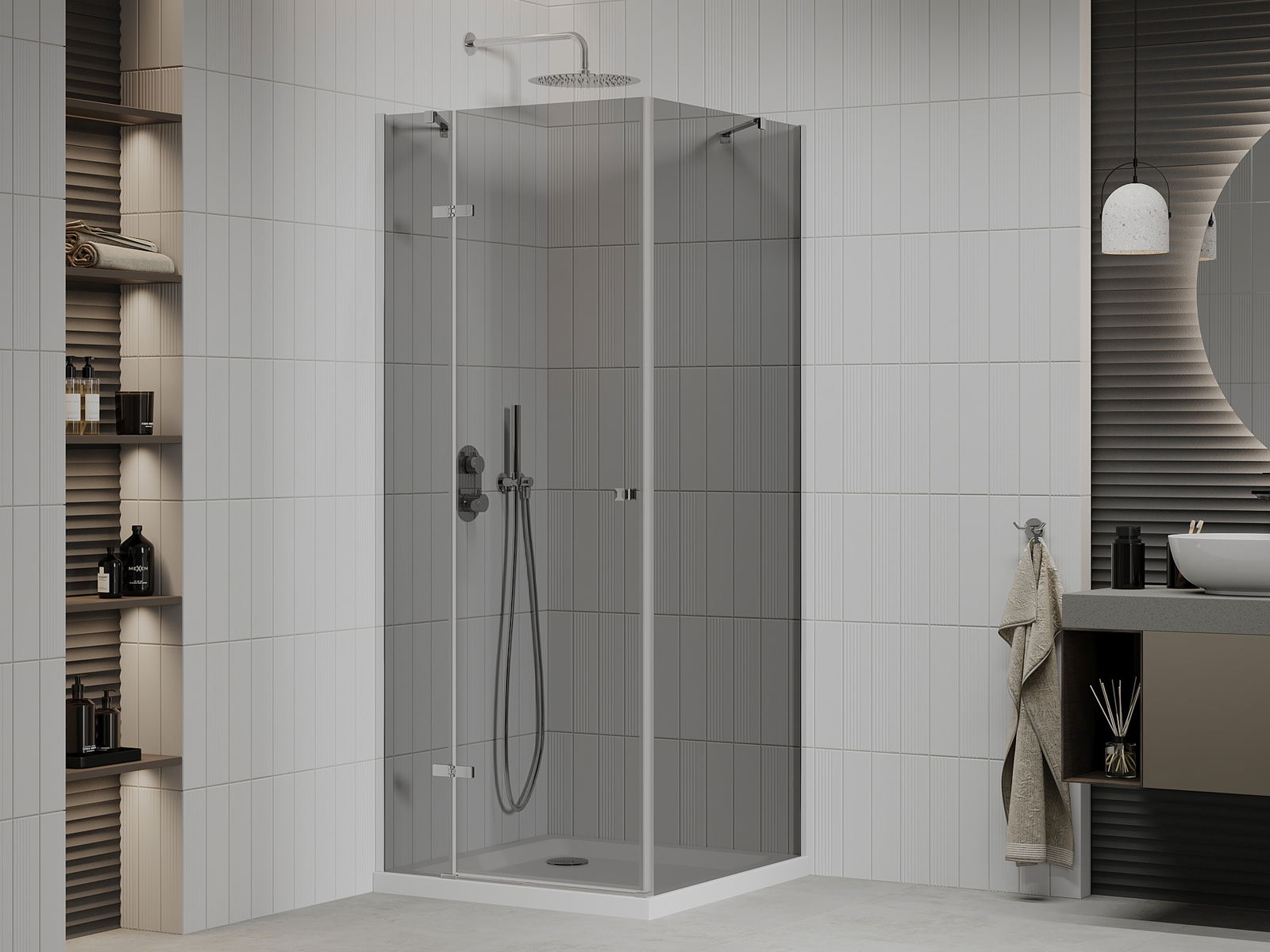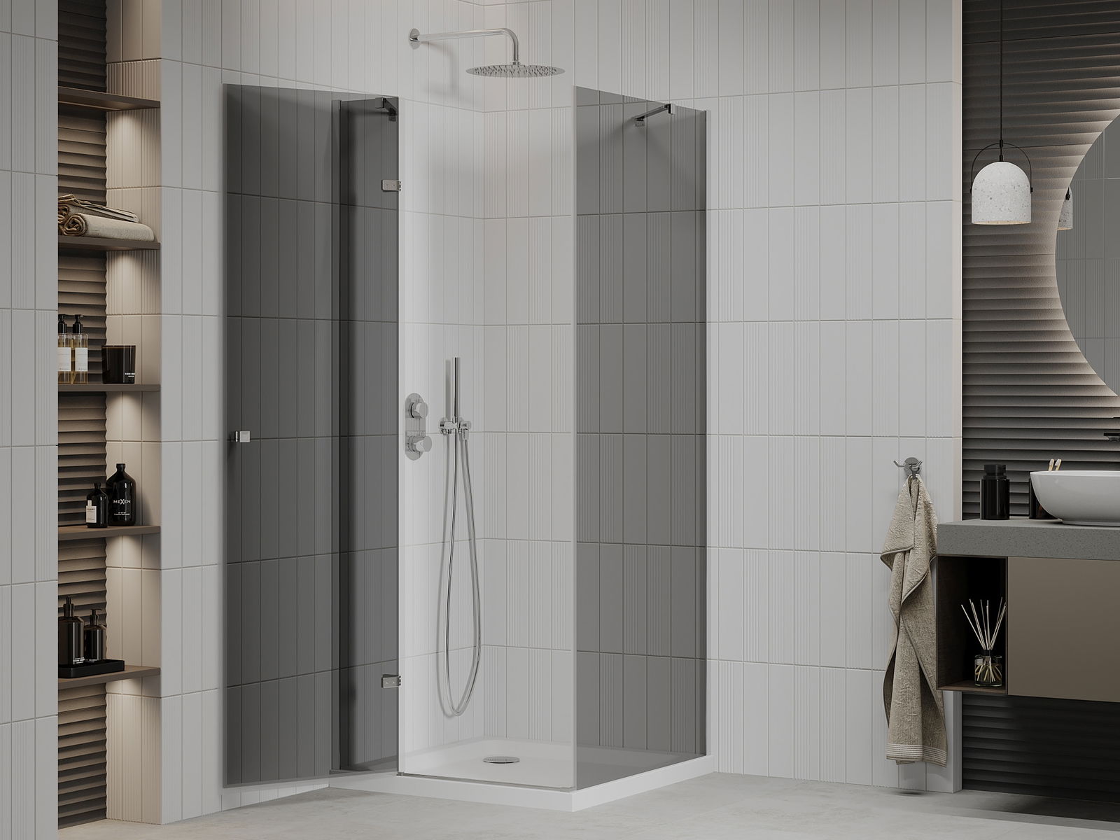 Priročen in udoben ročaj je izdelan iz trpežnega in odpornega kovine. Modna oblika v kombinaciji z zaključkom, ki ustreza barvi profilov, daje celoti sodoben in stilski videz, poudarjajoč estetiko vsake kopalnice.