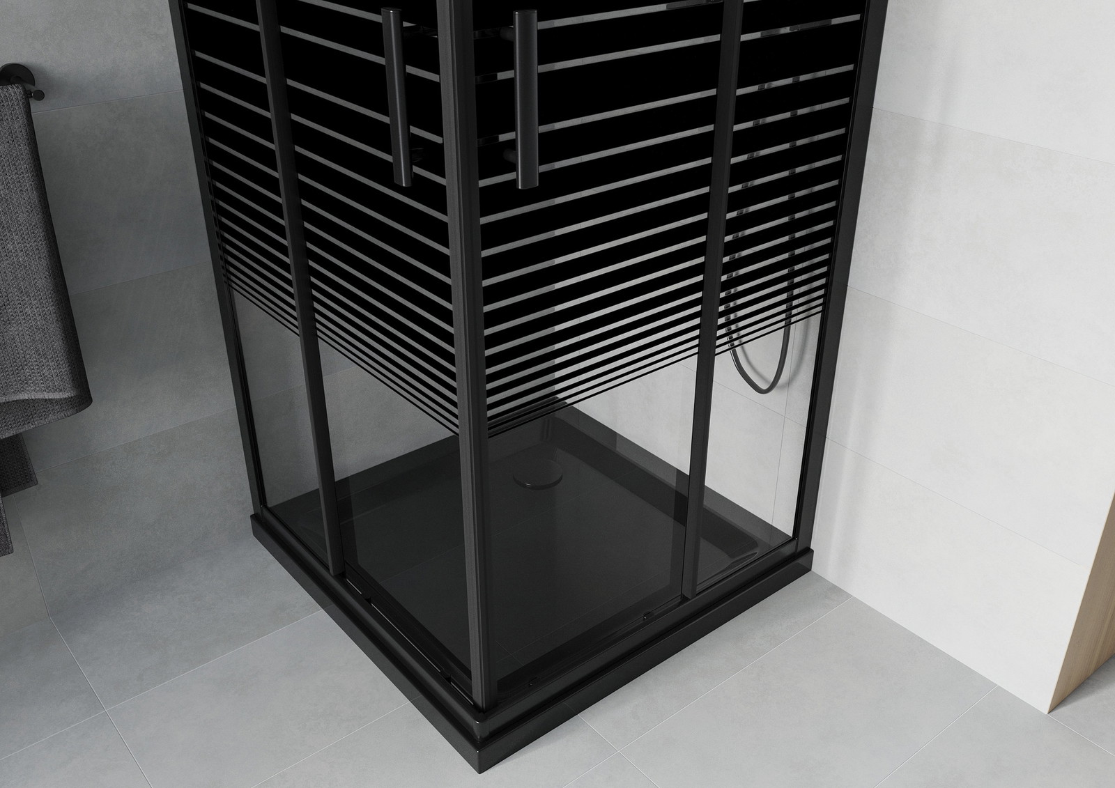 Priročen in udoben ročaj je izdelan iz trpežnega in odpornega kovine. Modna oblika v kombinaciji z zaključkom, ki ustreza barvi profilov, daje celoti sodoben in stilski videz, poudarjajoč estetiko vsake kopalnice.