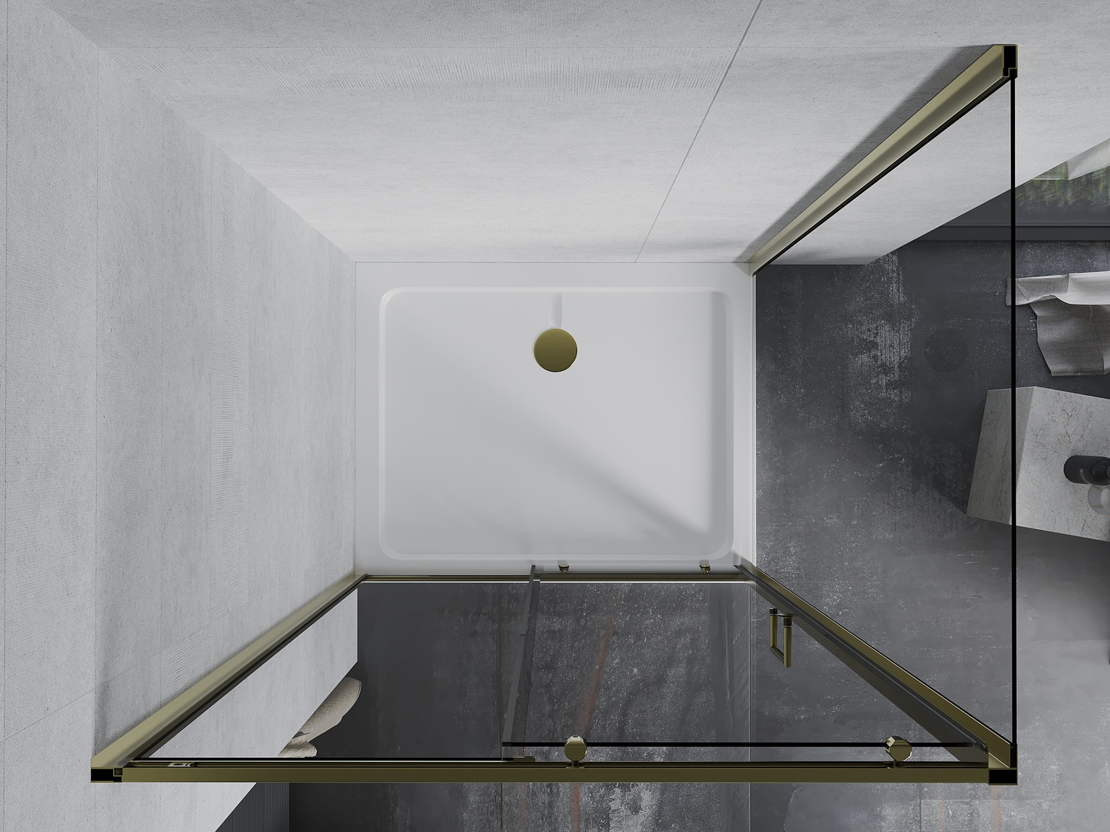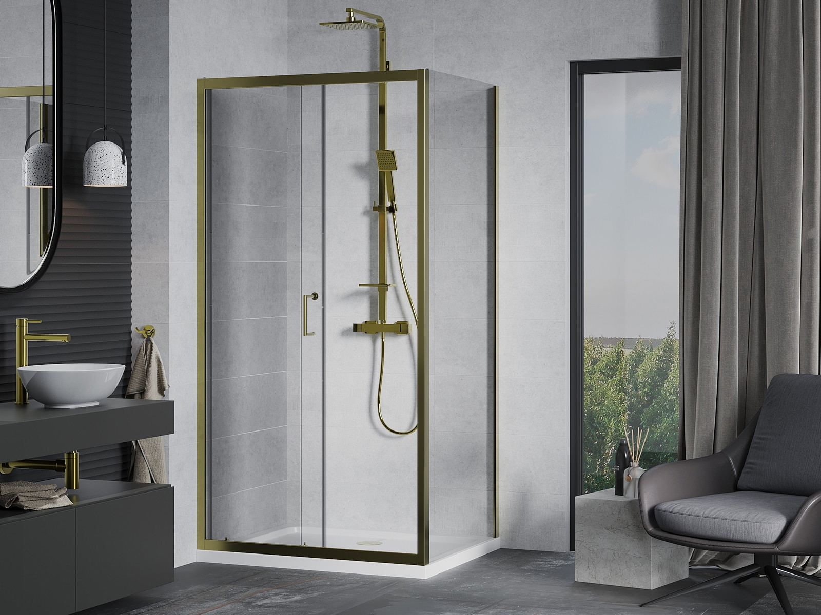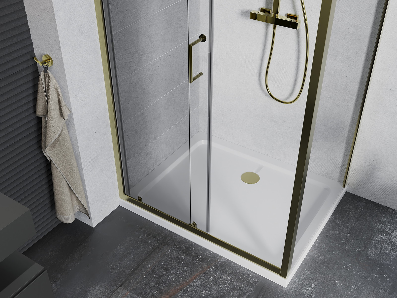 Priročen in udoben ročaj je izdelan iz trpežnega in odpornega kovine. Modna oblika v kombinaciji z zaključkom, ki ustreza barvi profilov, daje celoti sodoben in stilski videz, poudarjajoč estetiko vsake kopalnice.