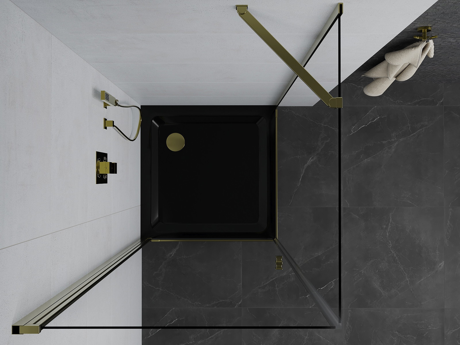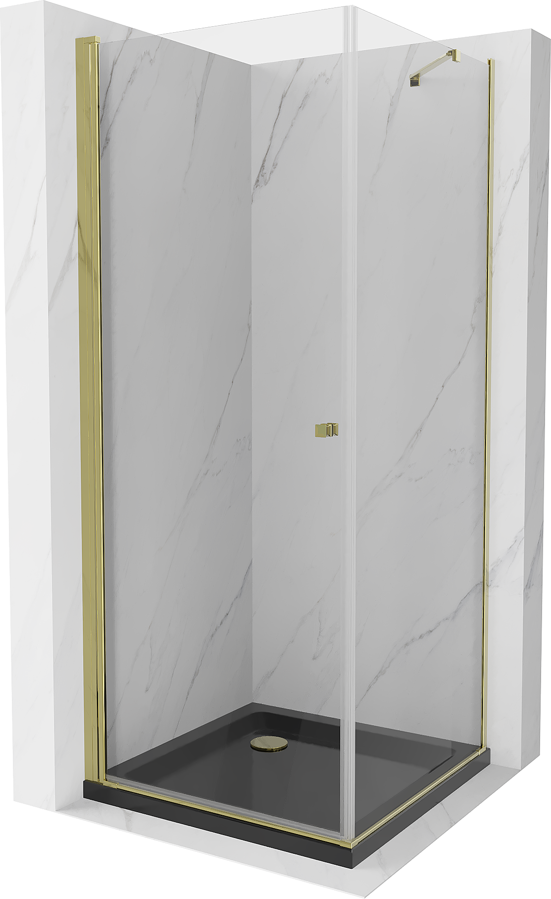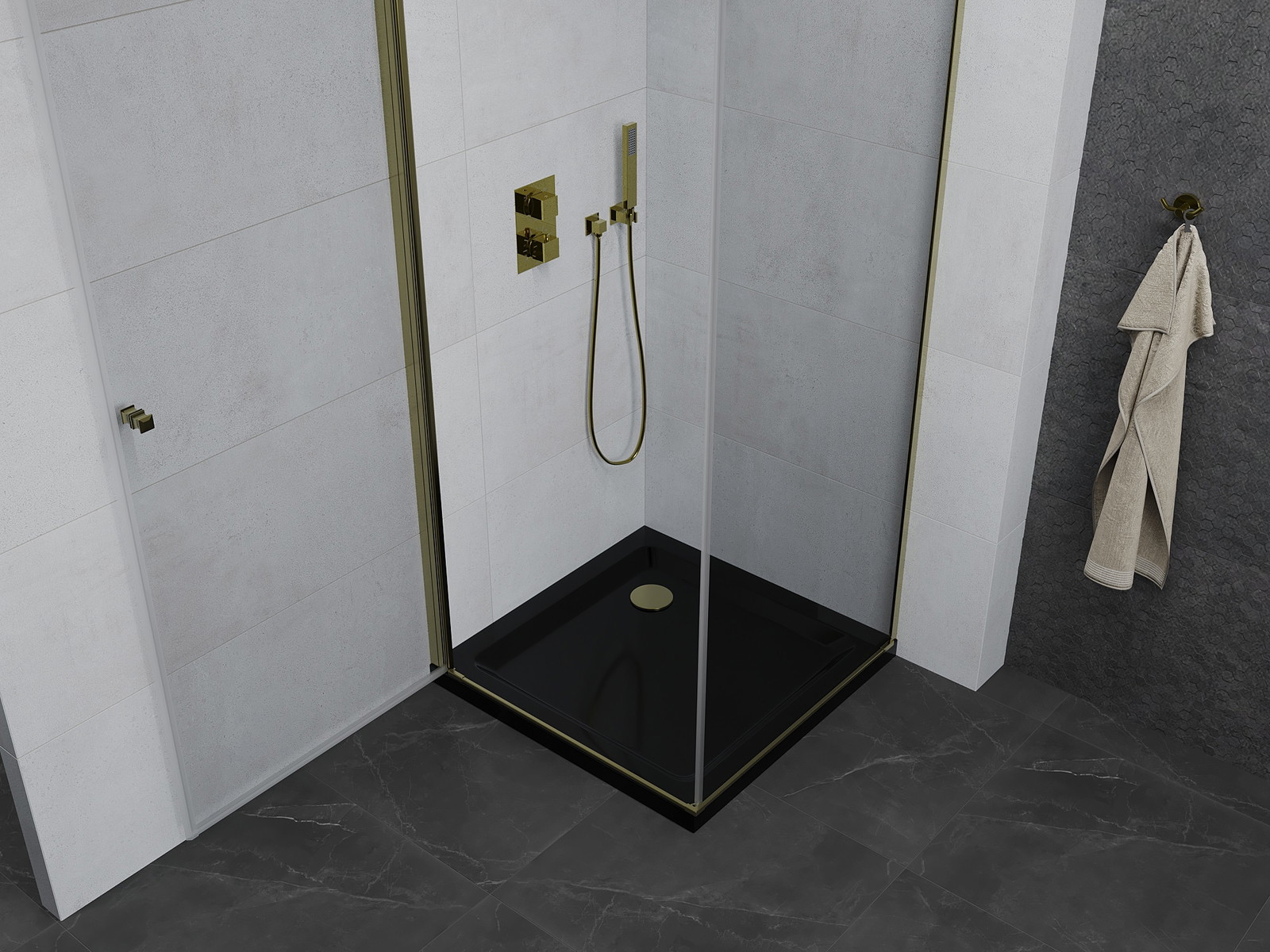 Mexen Pretoria nihajna tuš kabina 90 x 90 cm, prosojna, zlata + Flat tuš kad, črna - 852-090-090-50-00-4070G