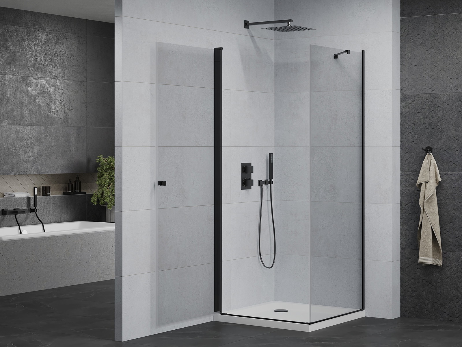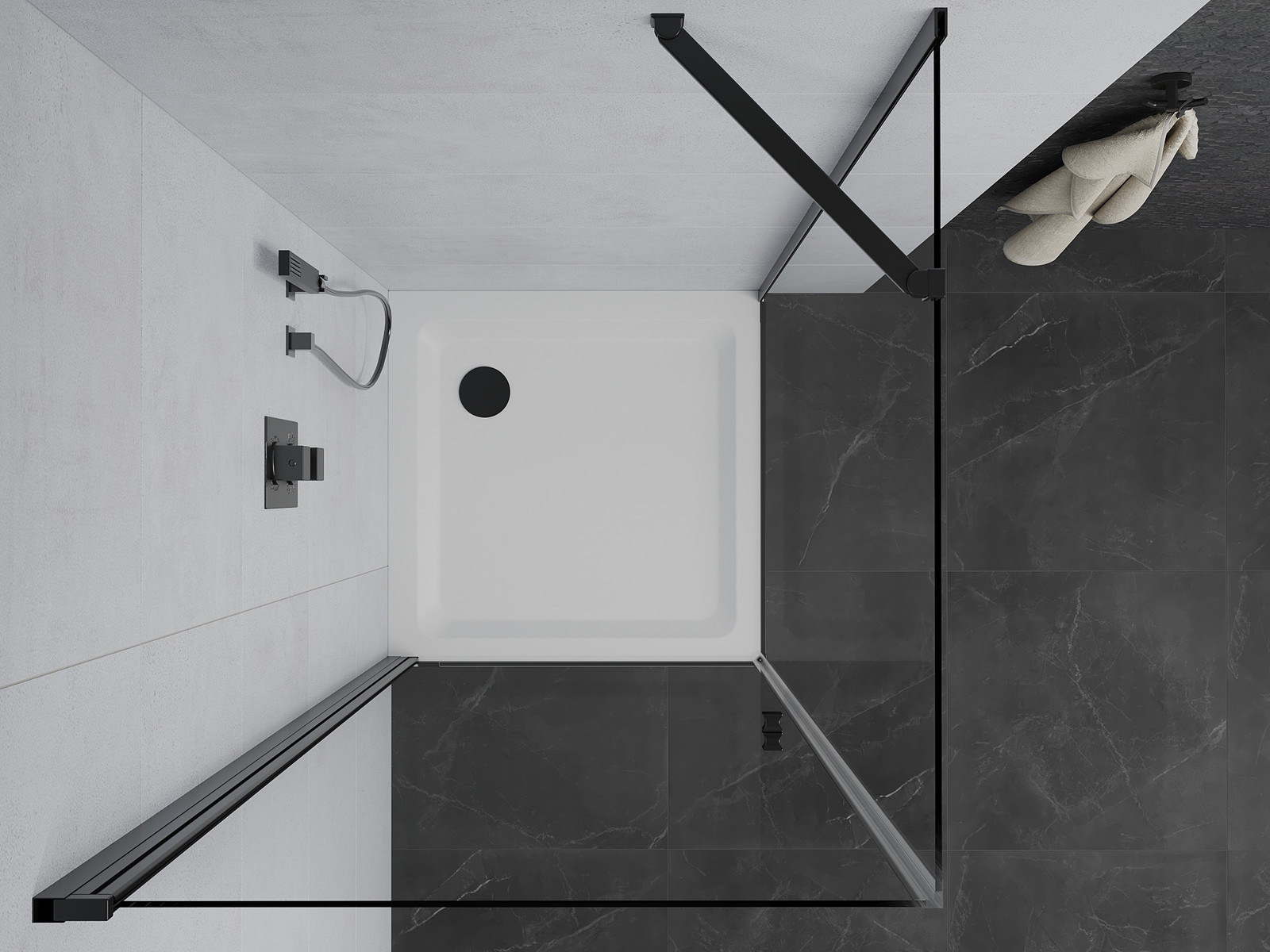 Priročen in udoben ročaj je izdelan iz trpežnega in odpornega kovine. Modna oblika v kombinaciji z zaključkom, ki ustreza barvi profilov, daje celoti sodoben in stilski videz, poudarjajoč estetiko vsake kopalnice.