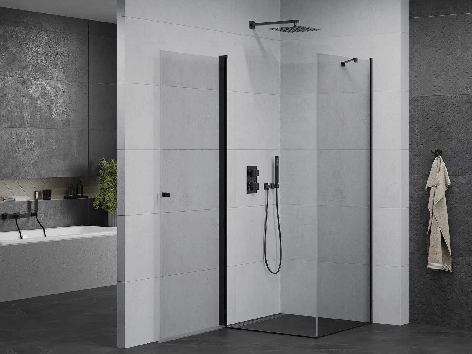 Priročen in udoben ročaj je izdelan iz trpežnega in odpornega kovine. Modna oblika v kombinaciji z zaključkom, ki ustreza barvi profilov, daje celoti sodoben in stilski videz, poudarjajoč estetiko vsake kopalnice.