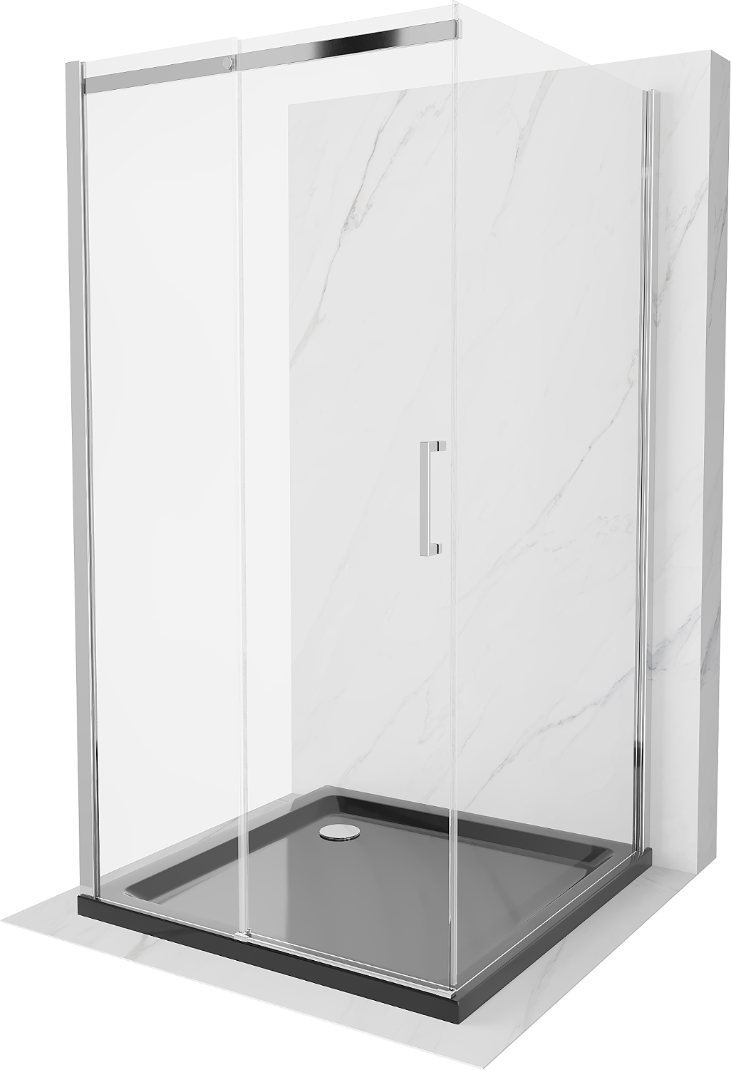 Mexen Omega-3S 3-stenska prha kabina, drsna 100x100 cm, prosojna, krom + pladenj Flat - 825-100-100-01-00-3s-4070