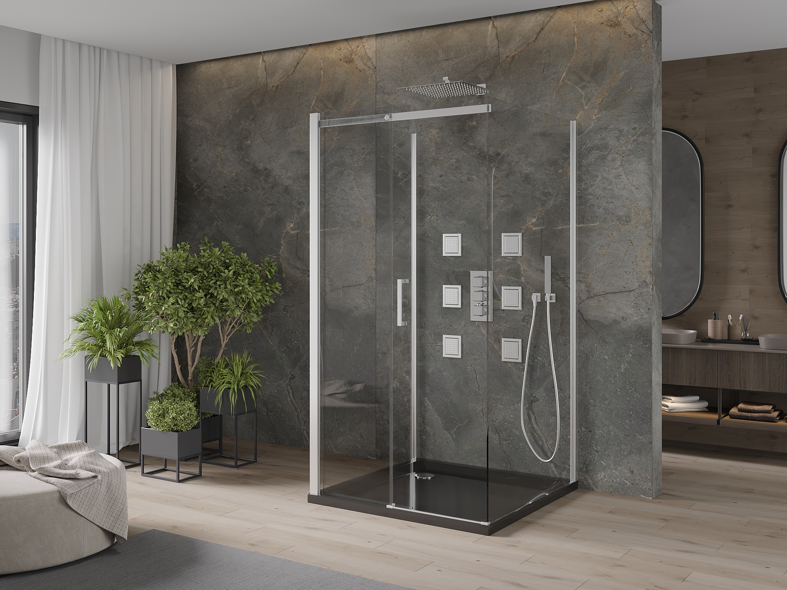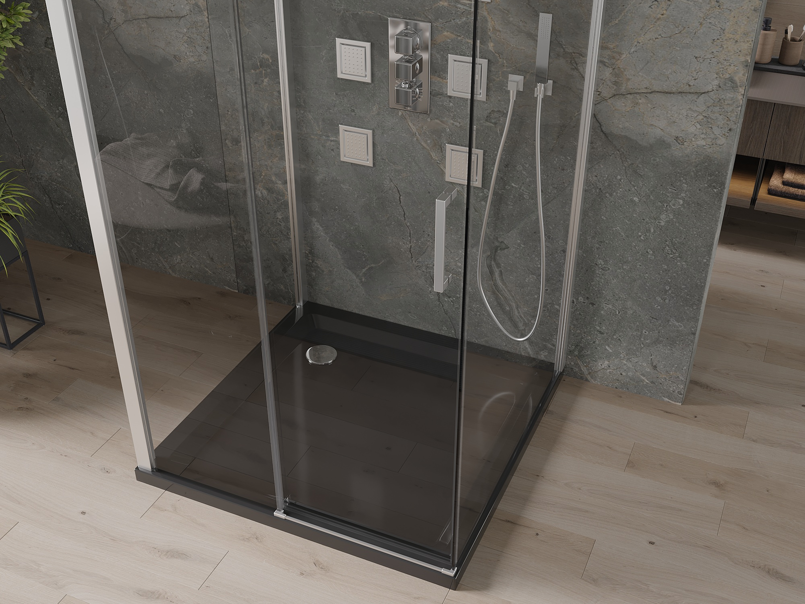 Zahvaljujoč uporabi univerzalnega sistema montaže je mogoče pršne vrata namestiti na desni ali levi strani, odvisno od potreb. Zahvaljujoč temu lahko z lahkoto oblikujete prho, prilagojeno prostoru v kopalnici.
