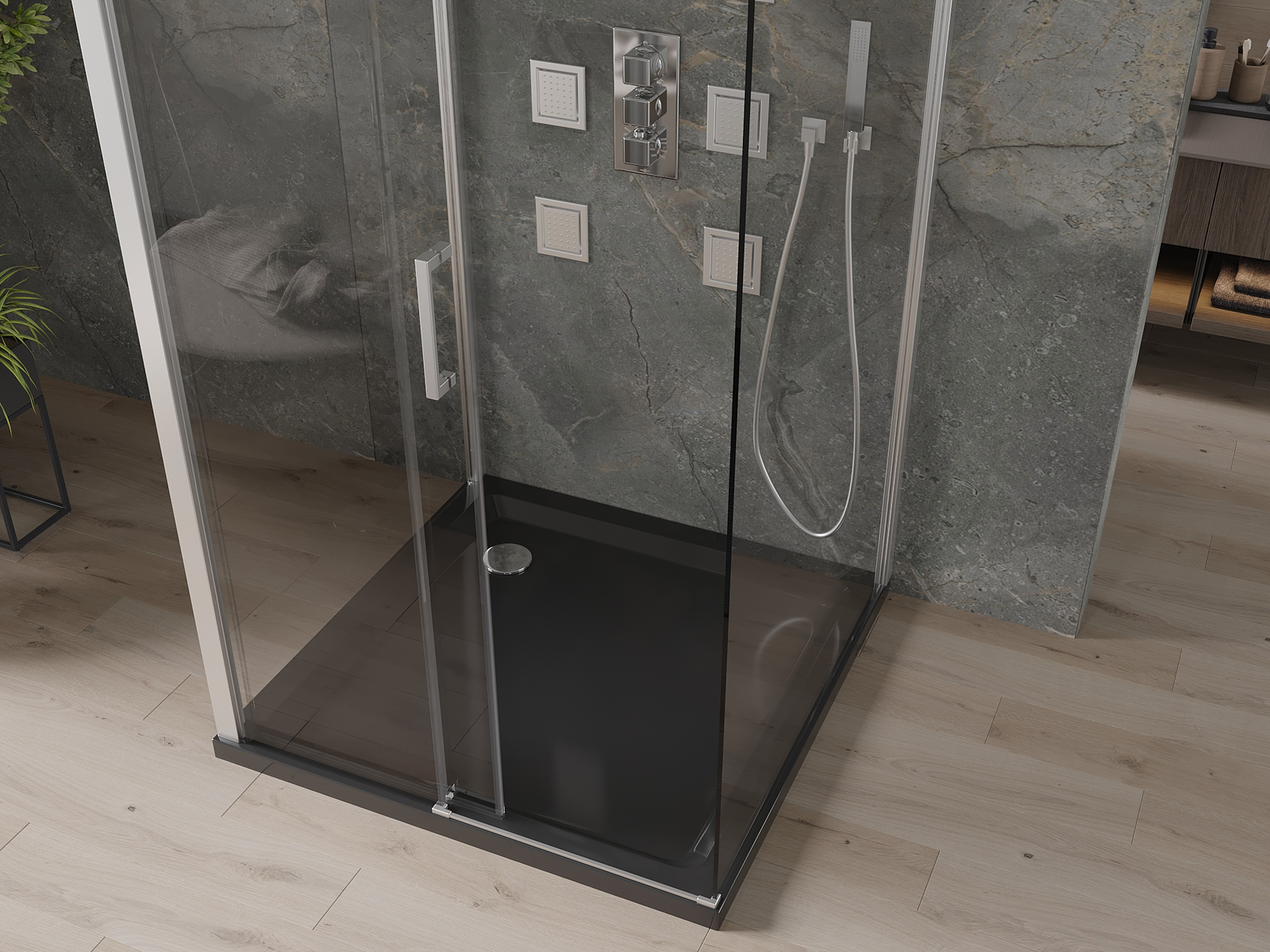 Priročen in udoben ročaj je izdelan iz trpežnega in odpornega kovine. Modna oblika v kombinaciji z zaključkom, ki ustreza barvi profilov, daje celoti sodoben in stilski videz, poudarjajoč estetiko vsake kopalnice.