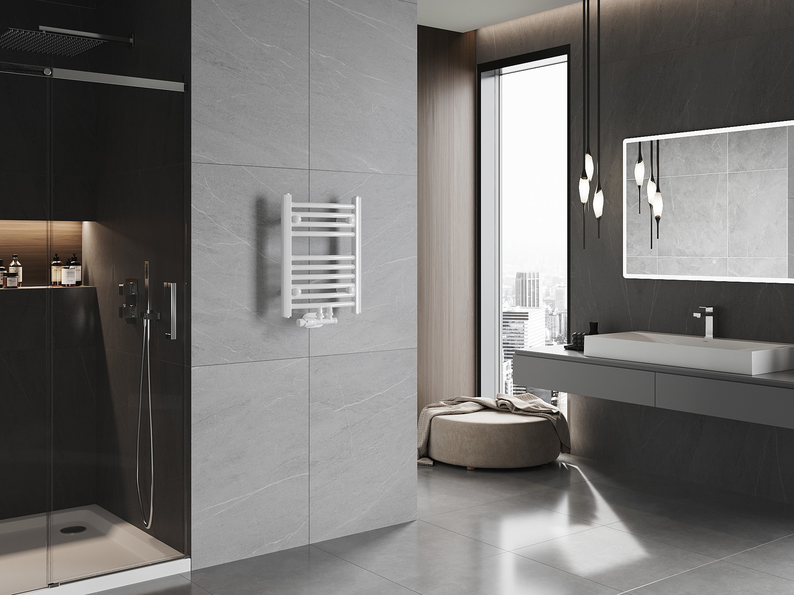 Mexen Ares kopalniški grelec je odlična rešitev za vsako kopalnico, zagotavlja toploto in estetiko. S kompaktnimi dimenzijami 500 x 400 mm in močjo 179 W se ta beli grelec RAL 9016 popolnoma vklopi v dizajn notranjosti. Izdelan iz visokokakovostnega jekla, je odporen proti koroziji zaradi trpežne lakirane prevleke. Njegova vsestranskost montaže (spodnji ali sredinski priključek) in možnost dodajanja grelca zagotavljajo fleksibilnost uporabe in enostavnost namestitve. Vsebuje potrebne montažne pribore.