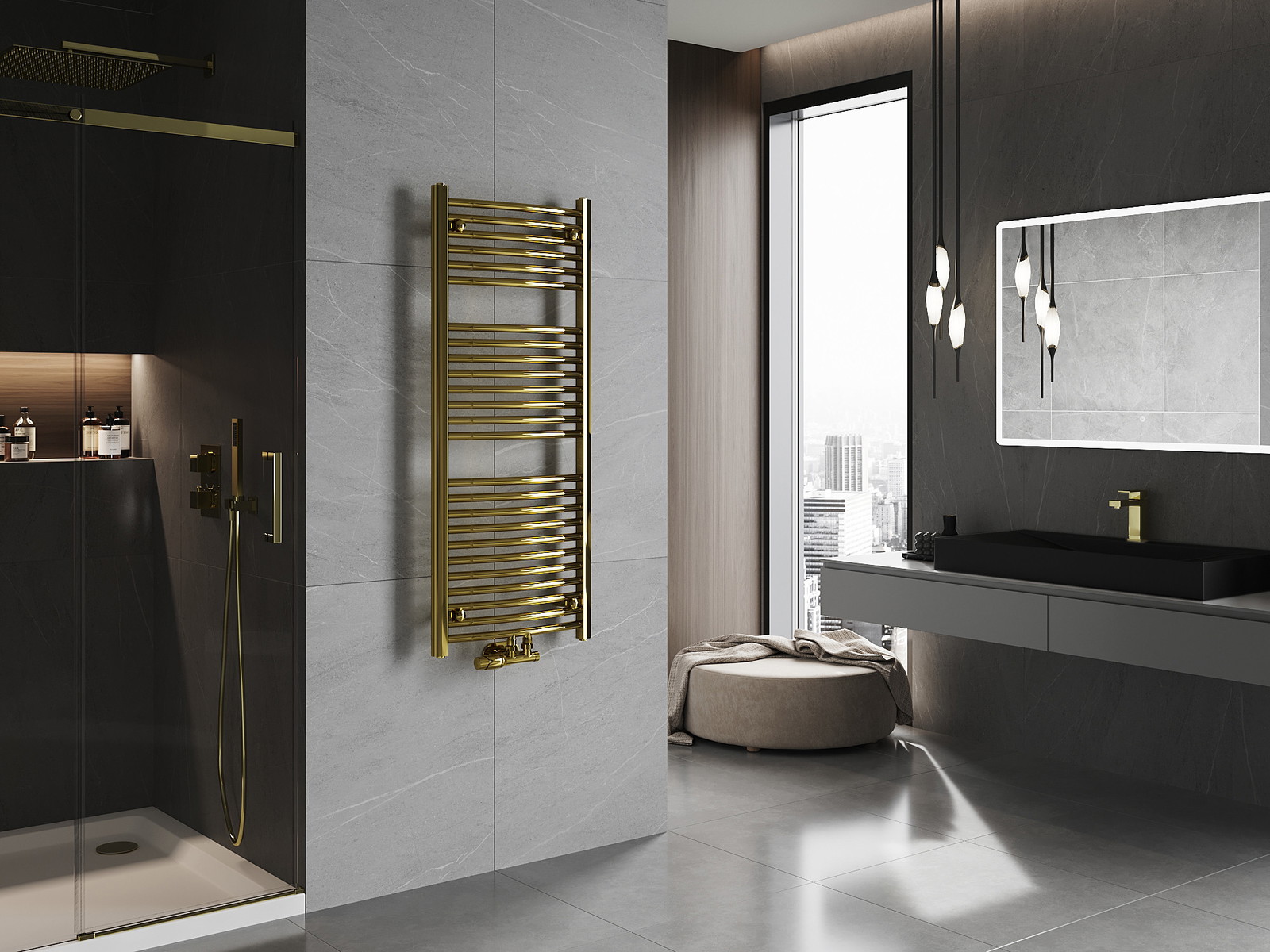 Radiator kopalnični Mexen Ares popolnoma združuje funkcionalnost z eleganco. Njegova zlata barva in trdna jeklena konstrukcija ga izpostavljata v vsaki kopalnici. Dimenzije 1200 x 500 mm zagotavljajo optimalno ogrevalno zmogljivost 420 W pri maksimalni delovni temperaturi 95 °C. Kljub majhni teži 8,37 kg je odporen na korozijo zaradi visokokakovostne lakirne prevleke. Možnost priključitve grelca in prilagodljive nastavitve priključkov zagotavljajo dodatno udobje uporabe.