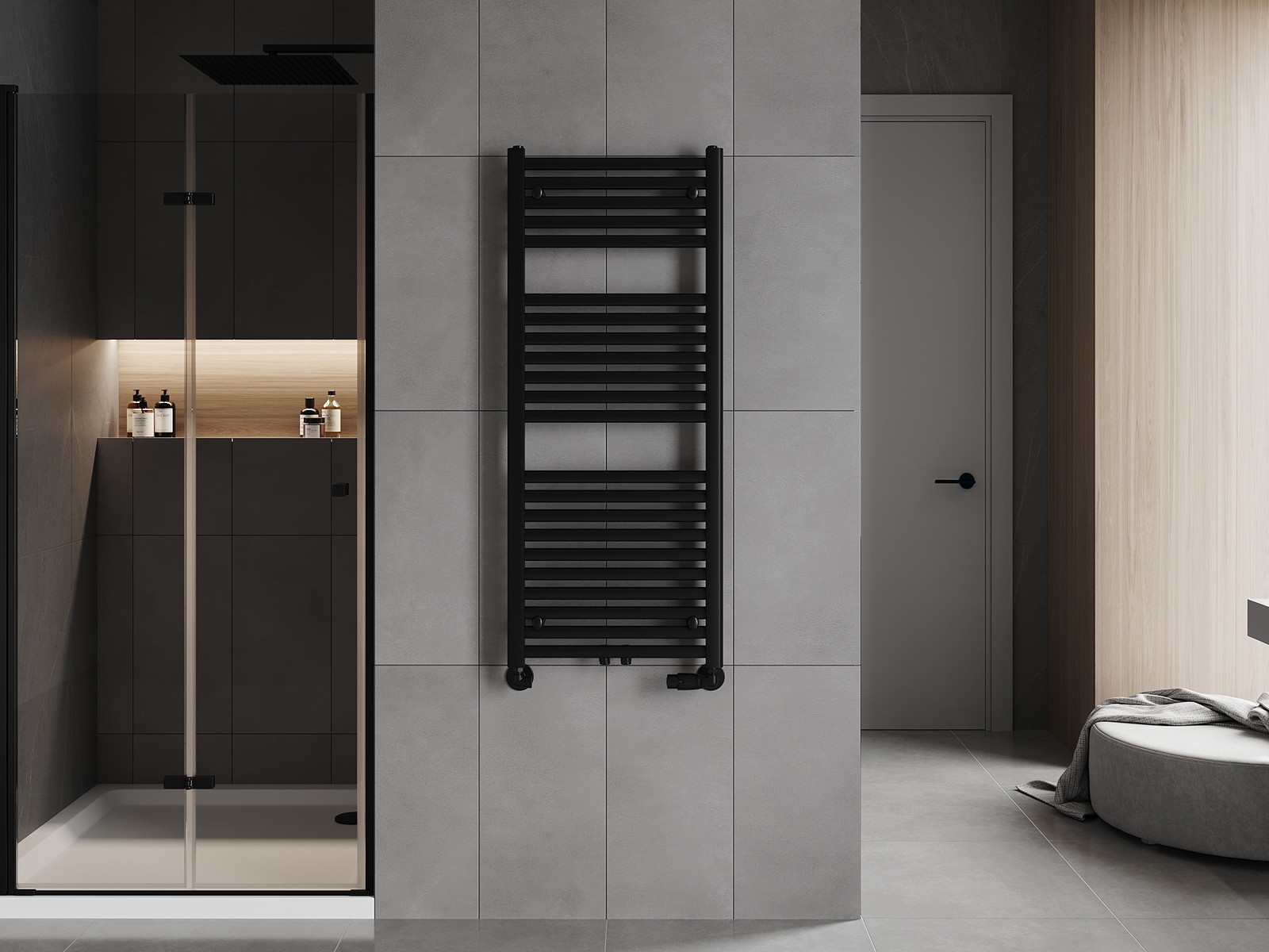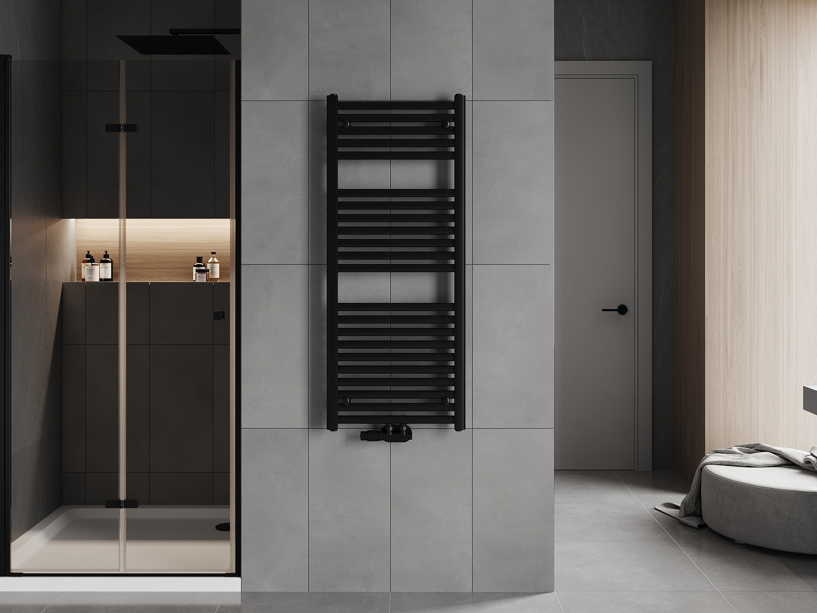 Mexen Hades je kopalniški radiator z dimenzijami 1200 x 500 mm, ki se ponaša z močjo 570 W in elegantnim črnim zaključkom (RAL 9005). Njegova trdna konstrukcija iz jekla zagotavlja visoko trajnost in odpornost proti koroziji. Je prilagojen za delovanje pri maksimalni temperaturi 95 °C in tlaku 0,6 Mpa. Dodatna prednost je možnost montaže grelne enote in različne opcije priključitve: srednja ali spodnja. V kompletu so vključeni nujni montažni dodatki in odzračevalnik.