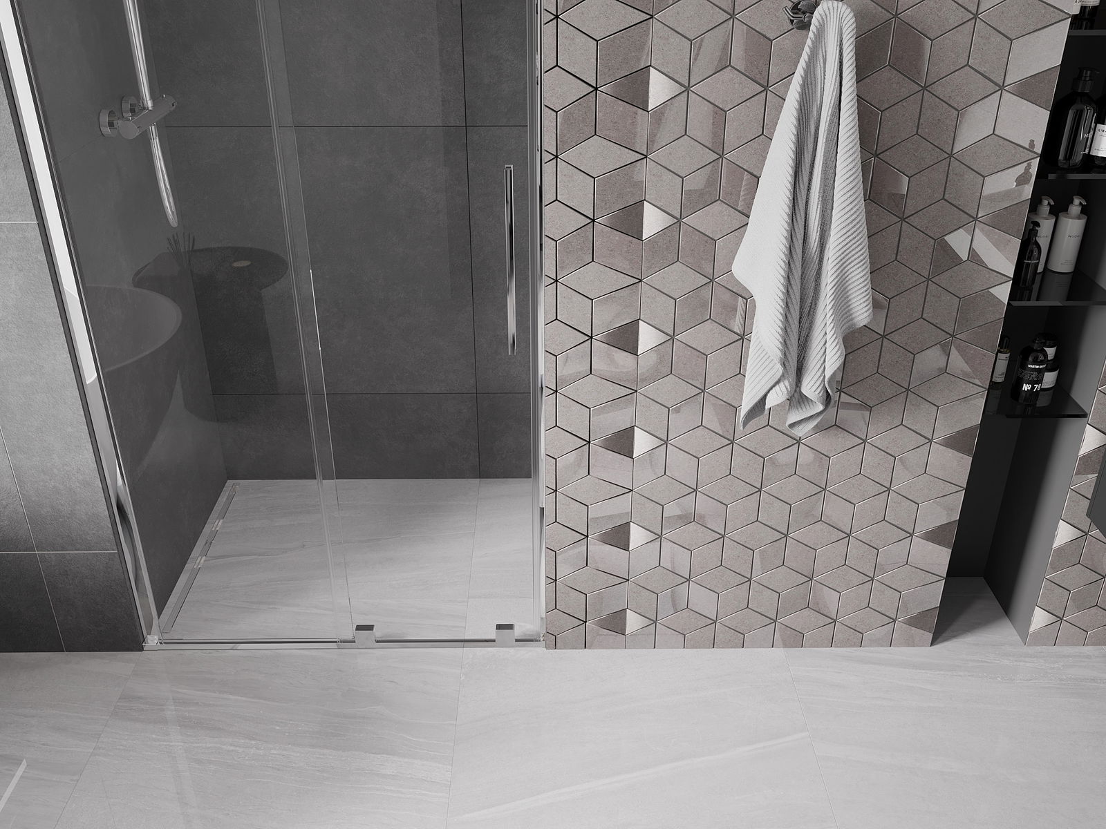 Priročen in udoben ročaj je izdelan iz nerjavečega jekla. Modna oblika v kombinaciji s končno obdelavo, ki ustreza barvi profilov, daje celoti moderen in stiliziran videz ter poudarja estetiko vsake kopalnice.