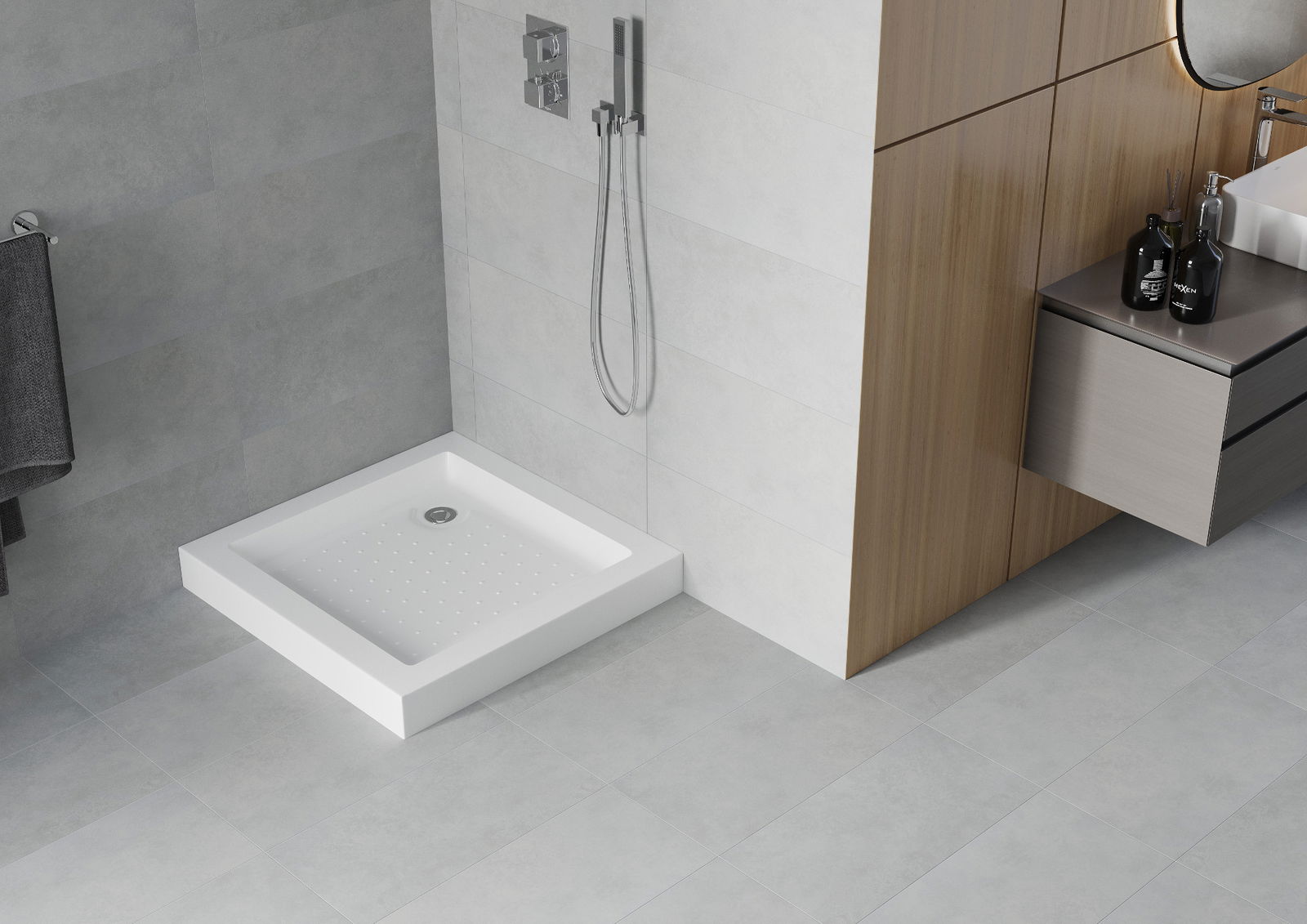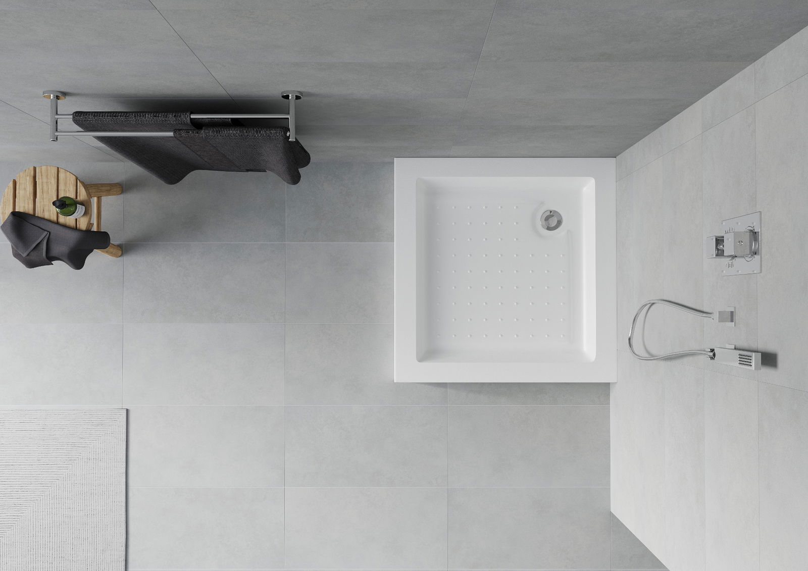 Pršni prostori imajo antidrsno površino, ki učinkovito zmanjšuje tveganje zdrsa med tuširanjem, s čimer ščiti pred padci in poškodbami. Zagotavlja udobje, varnost in stabilnost tudi na mokri površini.