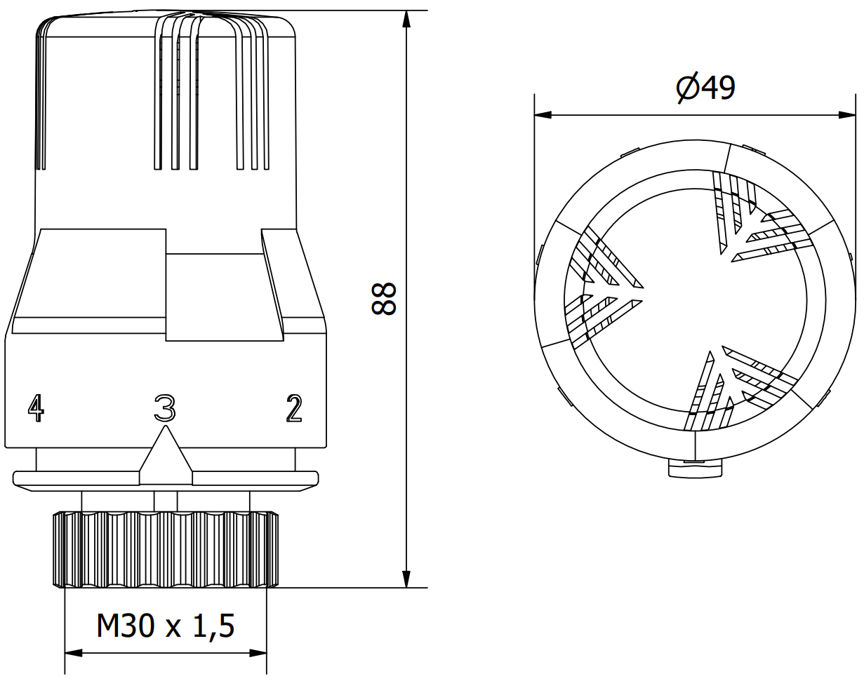To je standardna velikost navoja, ki se uporablja v mnogih termostatskih glavah, zlasti v napravah, ki se uporabljajo v ogrevalnih napravah. Simbol M30 označuje, da je zunanja premer navoja 30 mm, 1,5 mm pa pomeni, da je korak navoja 1,5 mm.