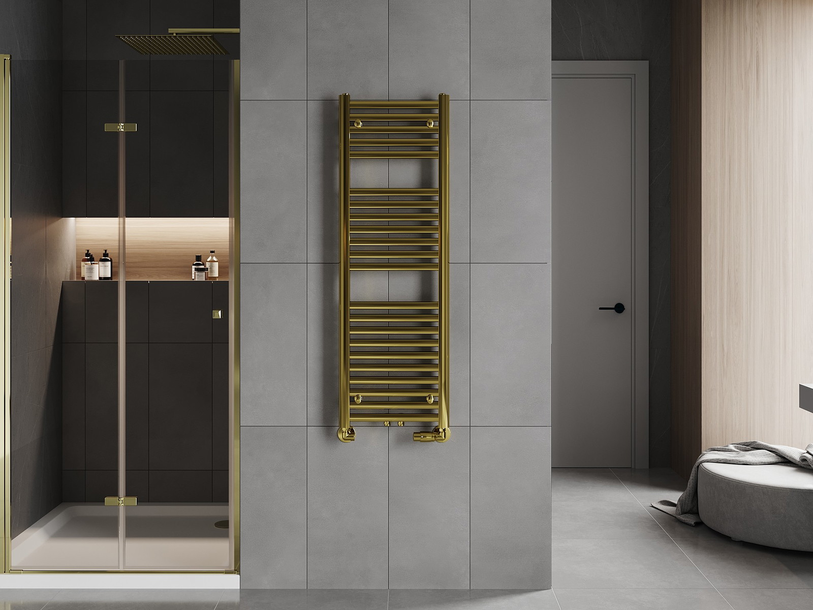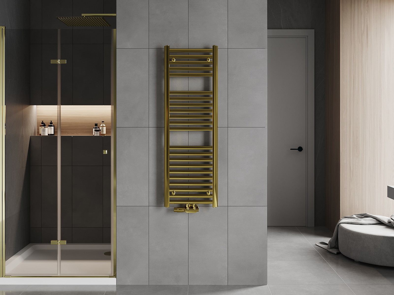 Mexen Hades je eleganten kopalniški radiator, ki združuje sodoben dizajn z odličnimi tehničnimi parametri. Izdelan iz visokokakovostnega jekla z zlatim zaključkom, se odlično prilega vsaki kopalnici. Njegova višina je 1200 mm, širina 400 mm, moč ogrevanja pa je 373 W pri temperaturi 75/65/20 °C. Omogoča montažo grelnika in ima različne možnosti priključkov, kar zagotavlja prilagodljivost pri montaži. Odporen proti koroziji, z lakirano prevleko razreda A1, je idealna izbira za zahtevne uporabnike.