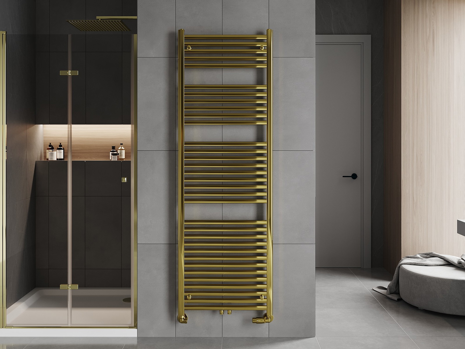 Mexen Hades je eleganten zlati kopalniški radiator z dimenzijami 1800 x 600 mm, ki ponuja grelno moč 790 W. Izdelan iz visokokakovostnega jekla, zagotavlja trpežnost in odpornost na korozijo zahvaljujoč odlični lakirni prevleki. Značilne delovne temperature maks. 95°C in tlak 0,6 Mpa. Ponuja prilagodljivost pri montaži z možnostjo sredinskega ali spodnjega priključka in možnostjo namestitve grelca. Komplet vsebuje obešalnike, montažni komplet in čepke.