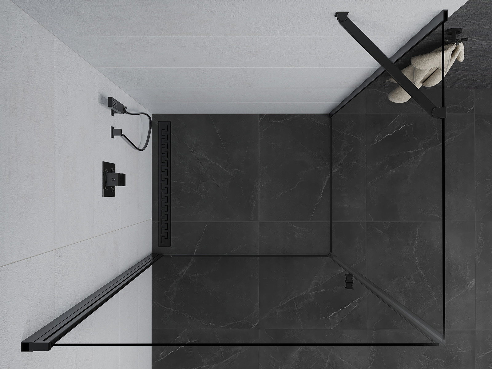 Priročen in udoben ročaj je izdelan iz trpežnega in odpornega kovine. Modna oblika v kombinaciji z zaključkom, ki ustreza barvi profilov, daje celoti sodoben in stilski videz, poudarjajoč estetiko vsake kopalnice.