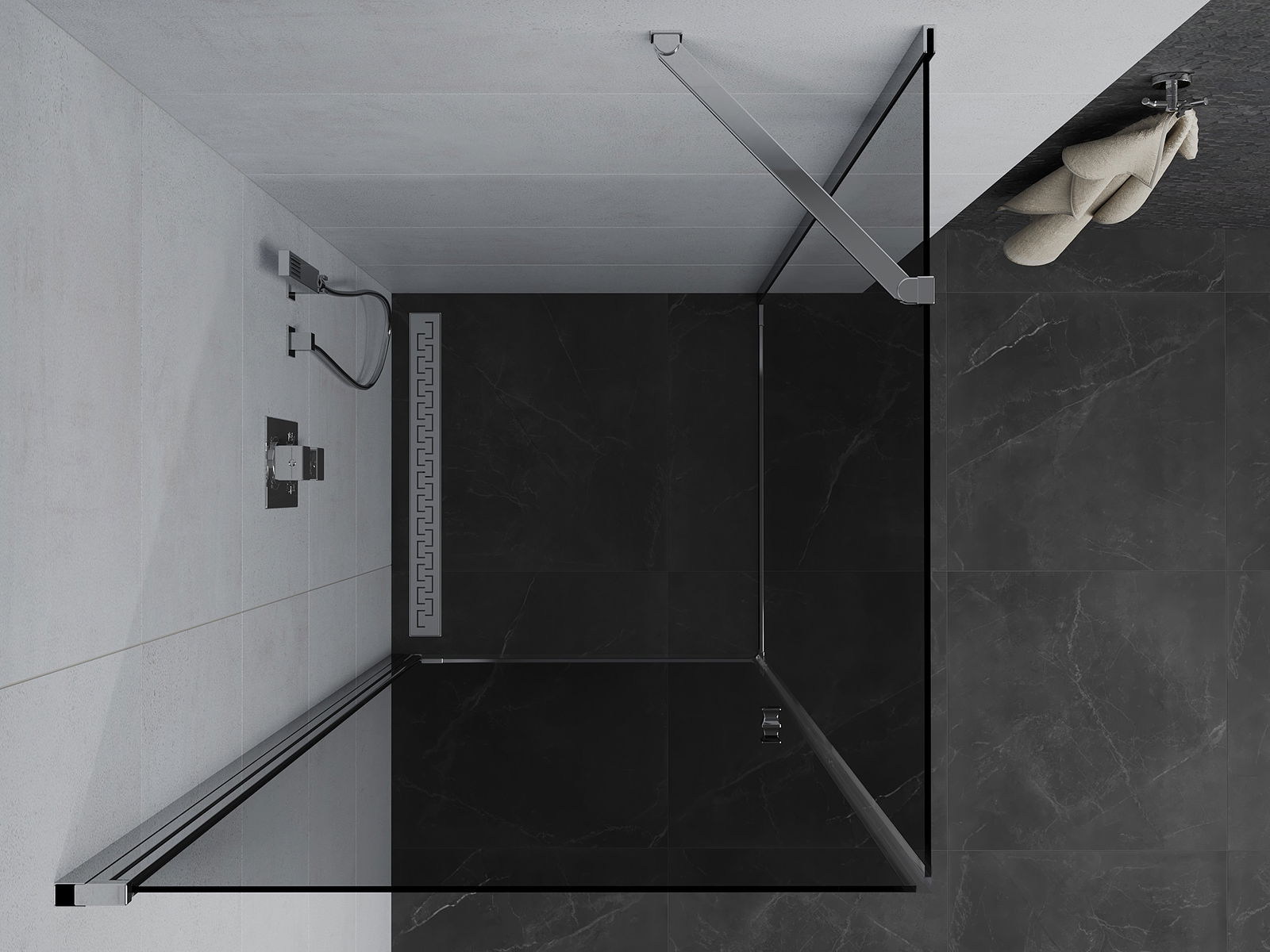 Priročen in udoben ročaj je izdelan iz trpežnega in odpornega kovine. Modna oblika v kombinaciji z zaključkom, ki ustreza barvi profilov, daje celoti sodoben in stilski videz, poudarjajoč estetiko vsake kopalnice.
