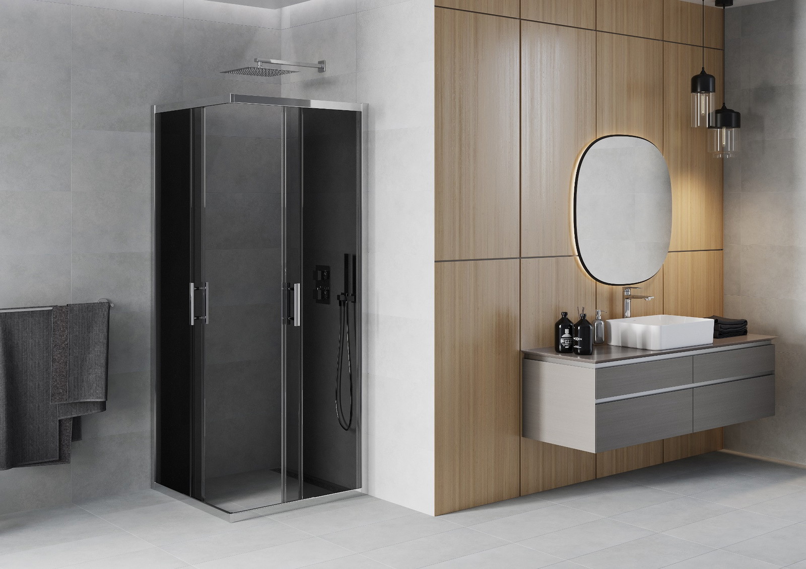 Priročen in udoben ročaj je izdelan iz trpežnega in odpornega kovine. Modna oblika v kombinaciji z zaključkom, ki ustreza barvi profilov, daje celoti sodoben in stilski videz, poudarjajoč estetiko vsake kopalnice.