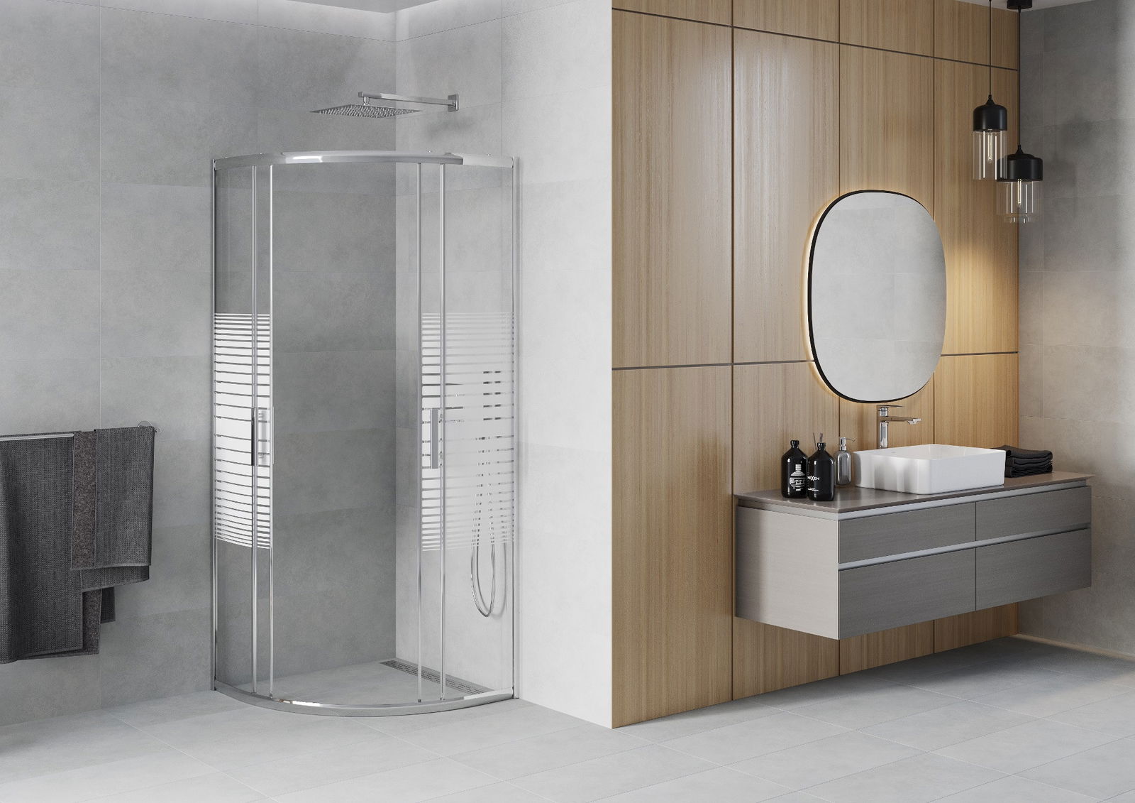 Priročen in udoben ročaj je izdelan iz trpežnega in odpornega kovine. Modna oblika v kombinaciji z zaključkom, ki ustreza barvi profilov, daje celoti sodoben in stilski videz, poudarjajoč estetiko vsake kopalnice.