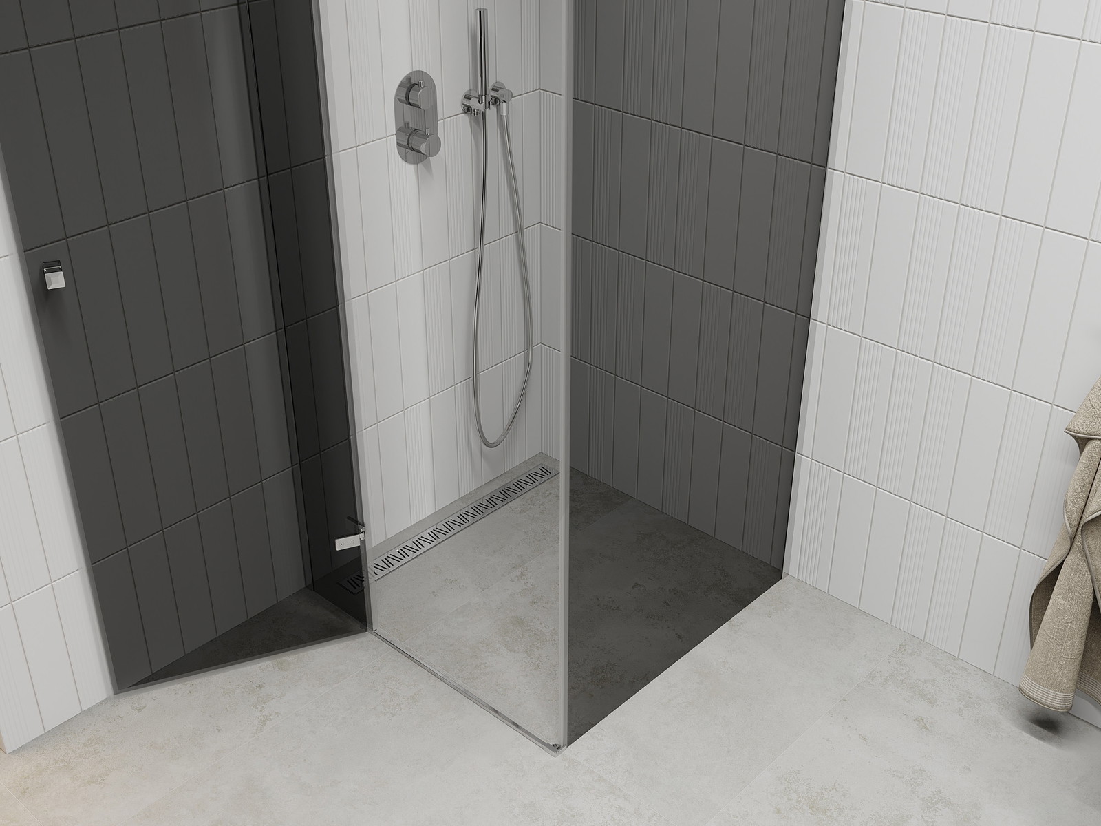Priročen in udoben ročaj je izdelan iz trpežnega in odpornega kovine. Modna oblika v kombinaciji z zaključkom, ki ustreza barvi profilov, daje celoti sodoben in stilski videz, poudarjajoč estetiko vsake kopalnice.