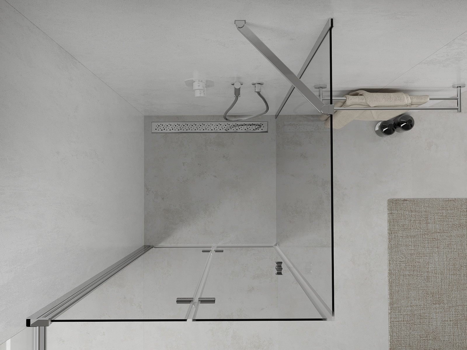 Priročen in udoben ročaj je izdelan iz trpežnega in odpornega kovine. Modna oblika v kombinaciji z zaključkom, ki ustreza barvi profilov, daje celoti sodoben in stilski videz, poudarjajoč estetiko vsake kopalnice.