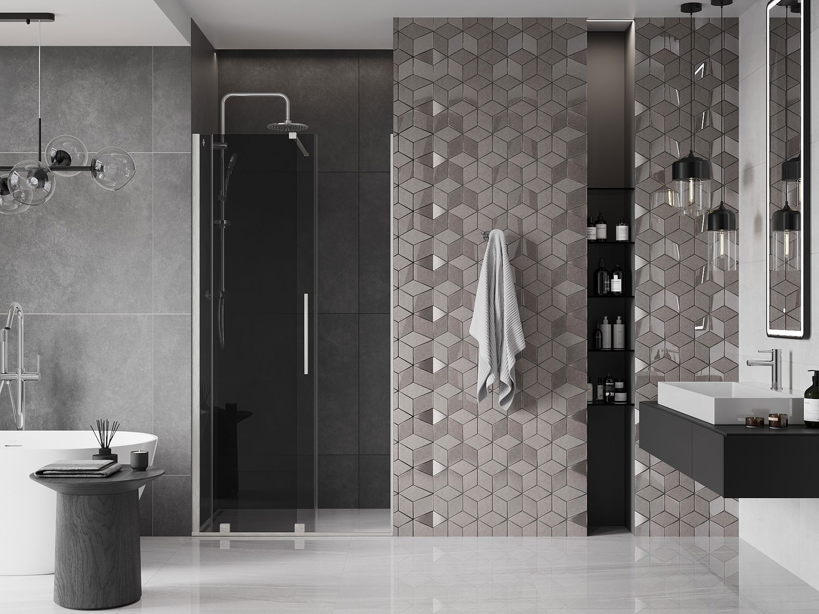 Priročen in udoben ročaj je izdelan iz nerjavečega jekla. Modna oblika v kombinaciji s končno obdelavo, ki ustreza barvi profilov, daje celoti moderen in stiliziran videz ter poudarja estetiko vsake kopalnice.