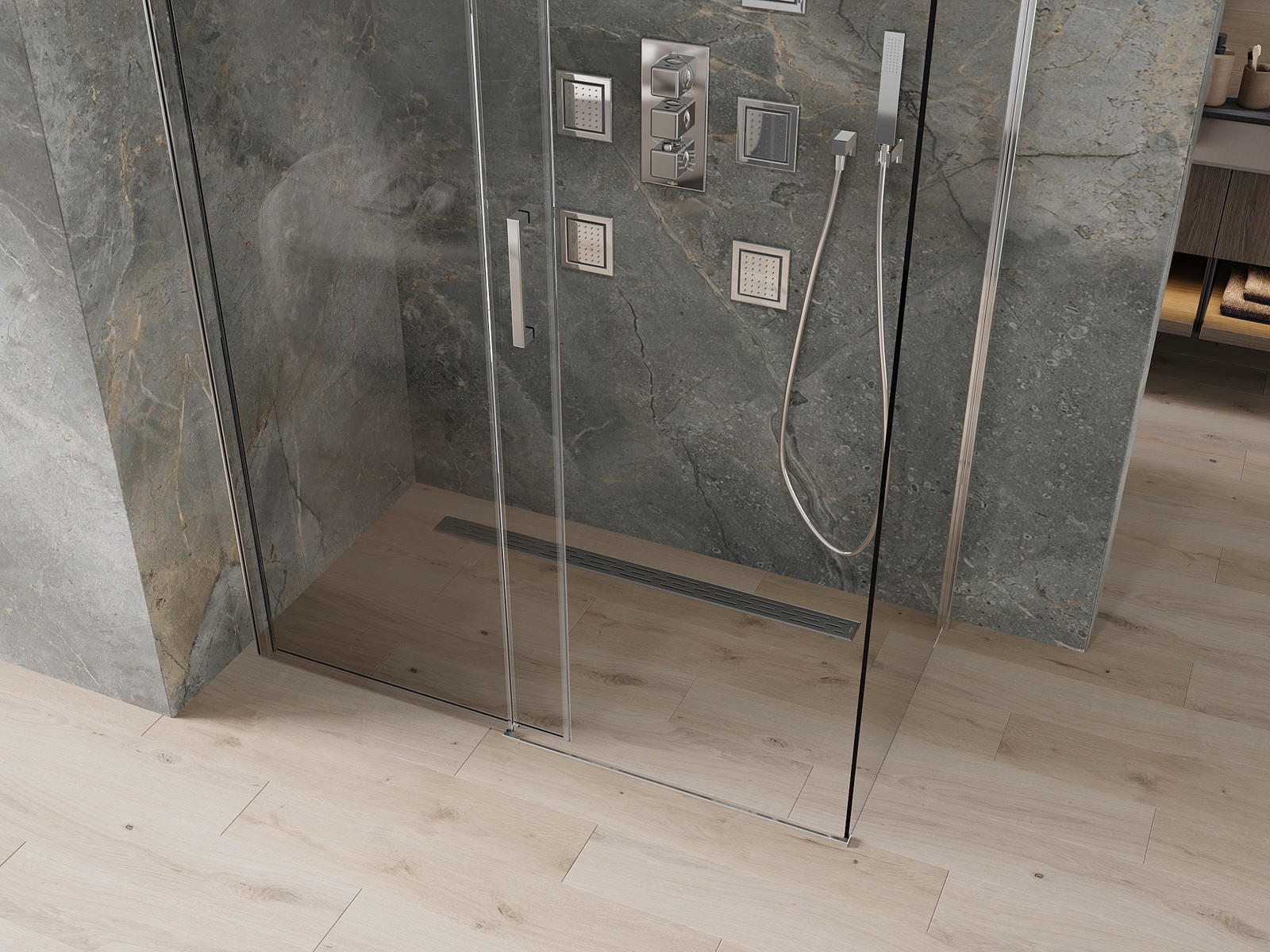Drsna vrata se premikajo po posebnih vodilih in ne potrebujejo dodatnega prostora za odpiranje, zato so primerna za manjše kopalnice. Zaradi dvojnih koles z kovinskim ohišjem je njihovo gibanje gladko.