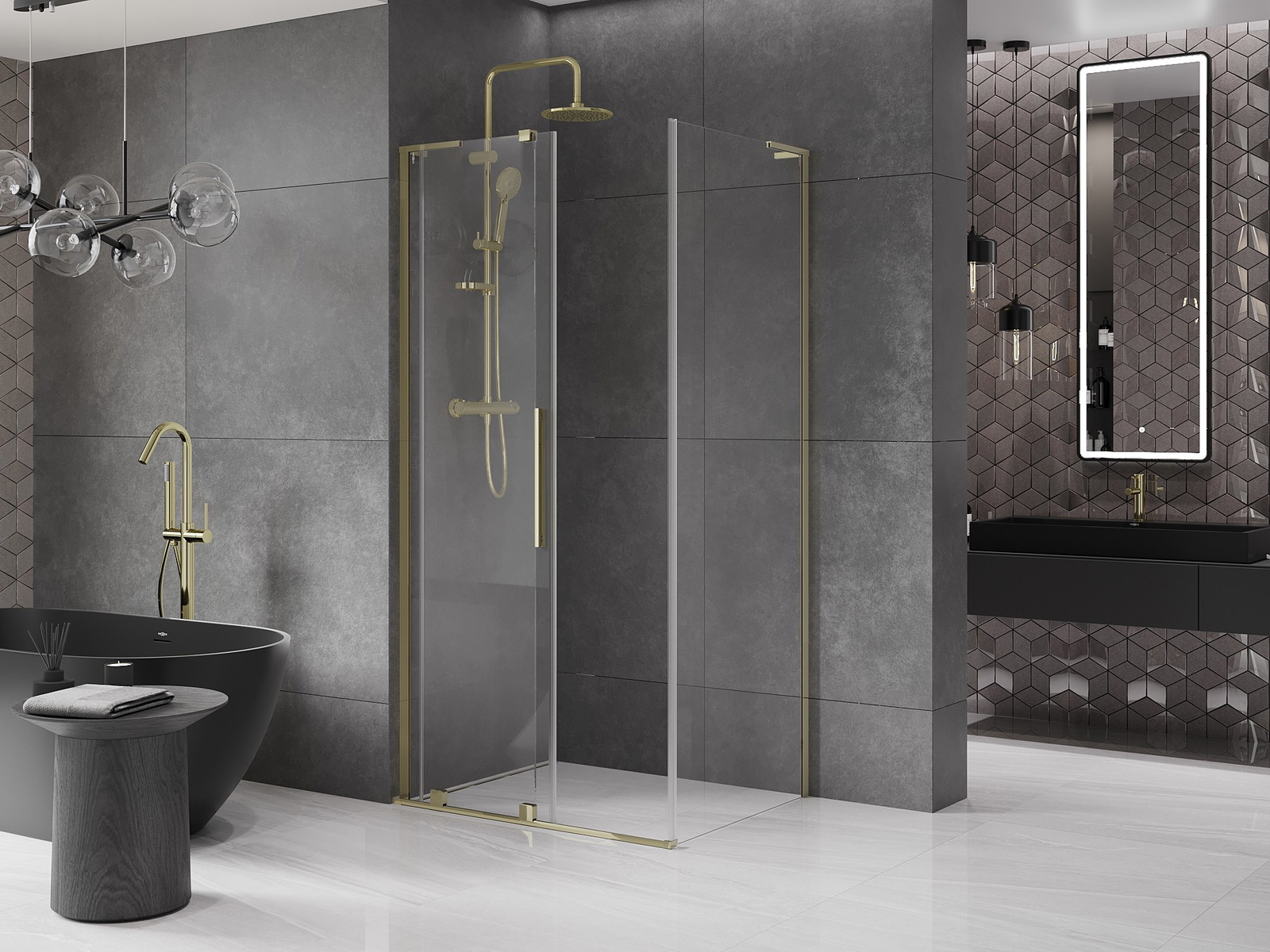 Mexen Velar L je izjemna drsna tuš kabina dimenzij 110x90 cm, ki združuje eleganco in funkcionalnost. Izdelana iz kaljenega stekla debeline 8 mm, zagotavlja varnost in trajnost. Prozorno steklo in zlati zaključek dodajata notranjosti razkošen videz. Univerzalna montaža omogoča prilagoditev vsaki kopalnici, možnost regulacije širine in izravnava neravnin sten pa zagotavljata enostavno namestitev. Poleg tega je kabina opremljena z jeklenimi elementi, kot sta kotni stabilizator in ročaj, ter premazom za lažje čiščenje, kar jo naredi praktično izbiro za dolga leta.
