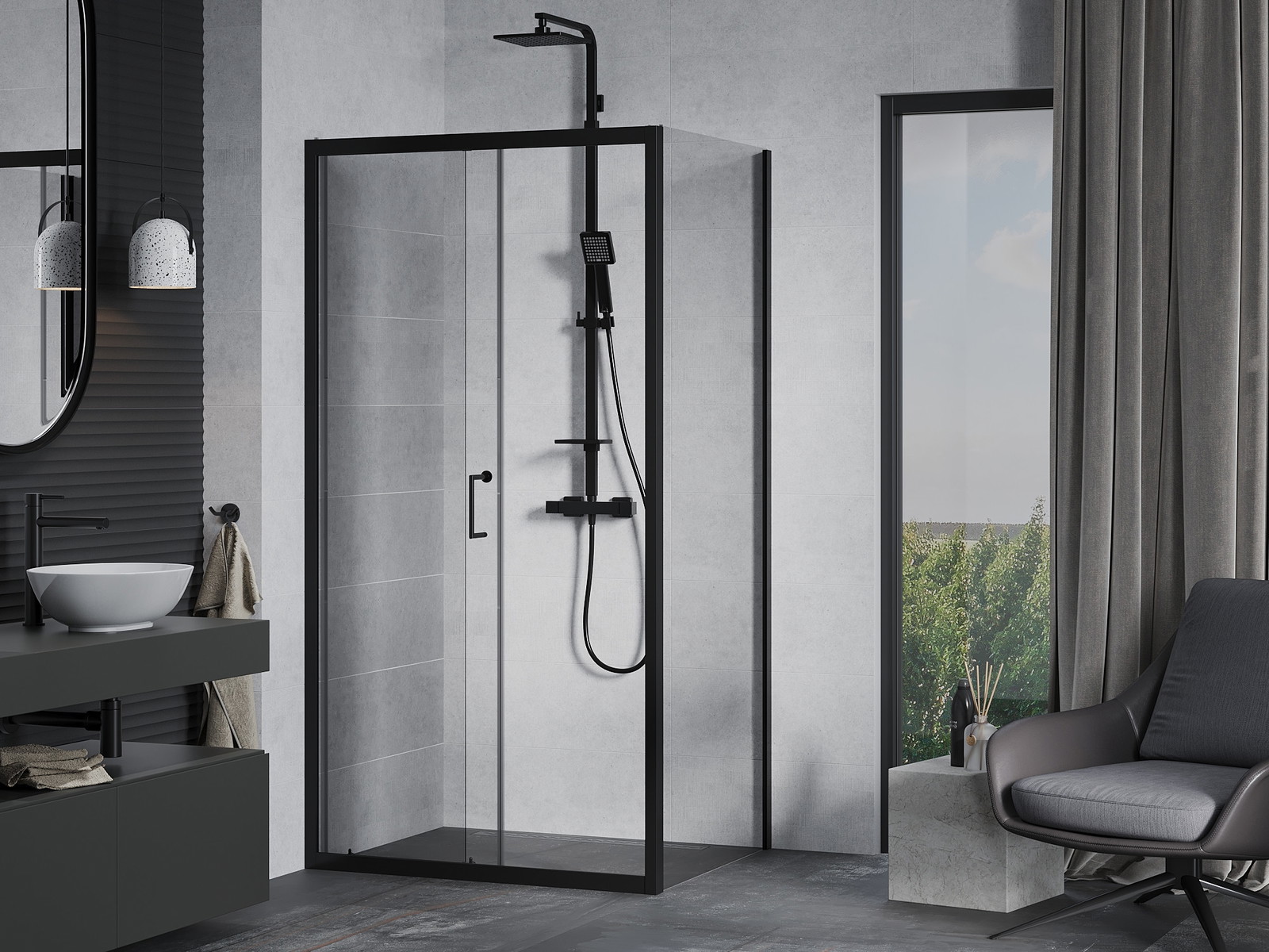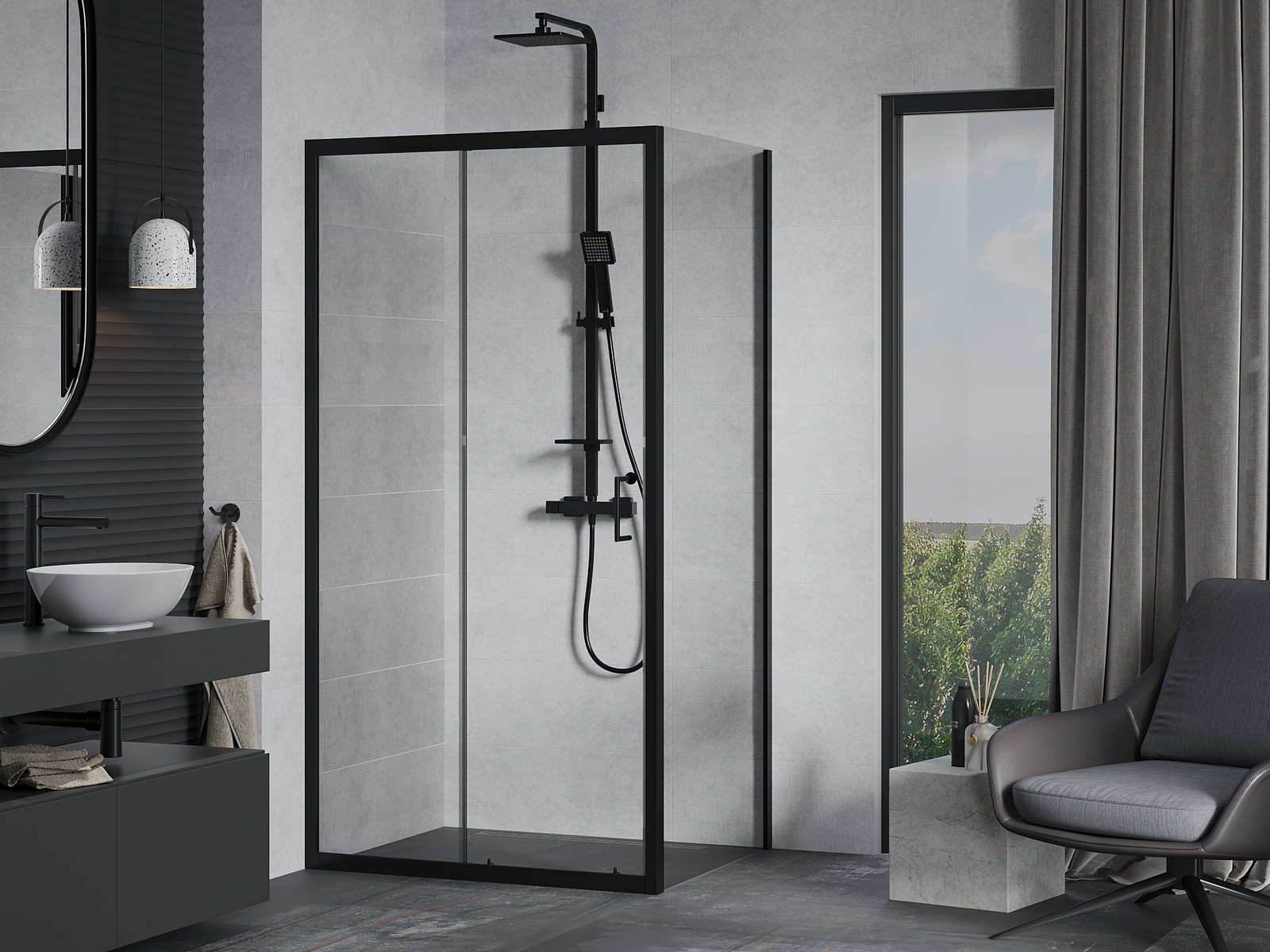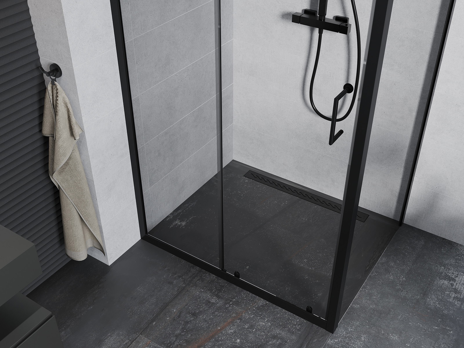 Mexen Apia je elegantna raztegljiva tuš kabina z dimenzijami 130 x 90 cm, ki se odlično prilega v sodobne kopalniške prostore. Značilna je prozorno, kaljeno steklo debeline 6 mm s premazom za lažje čiščenje. Črni aluminijasti okvir dodaja stil, univerzalna montaža pa omogoča namestitev na kad ali ploščice. Drsna vrata s kovinskim ročajem zagotavljajo udobje, sistem tesnil in pragovi pa učinkovito odvajajo vodo in izravnavajo neenakosti stene.