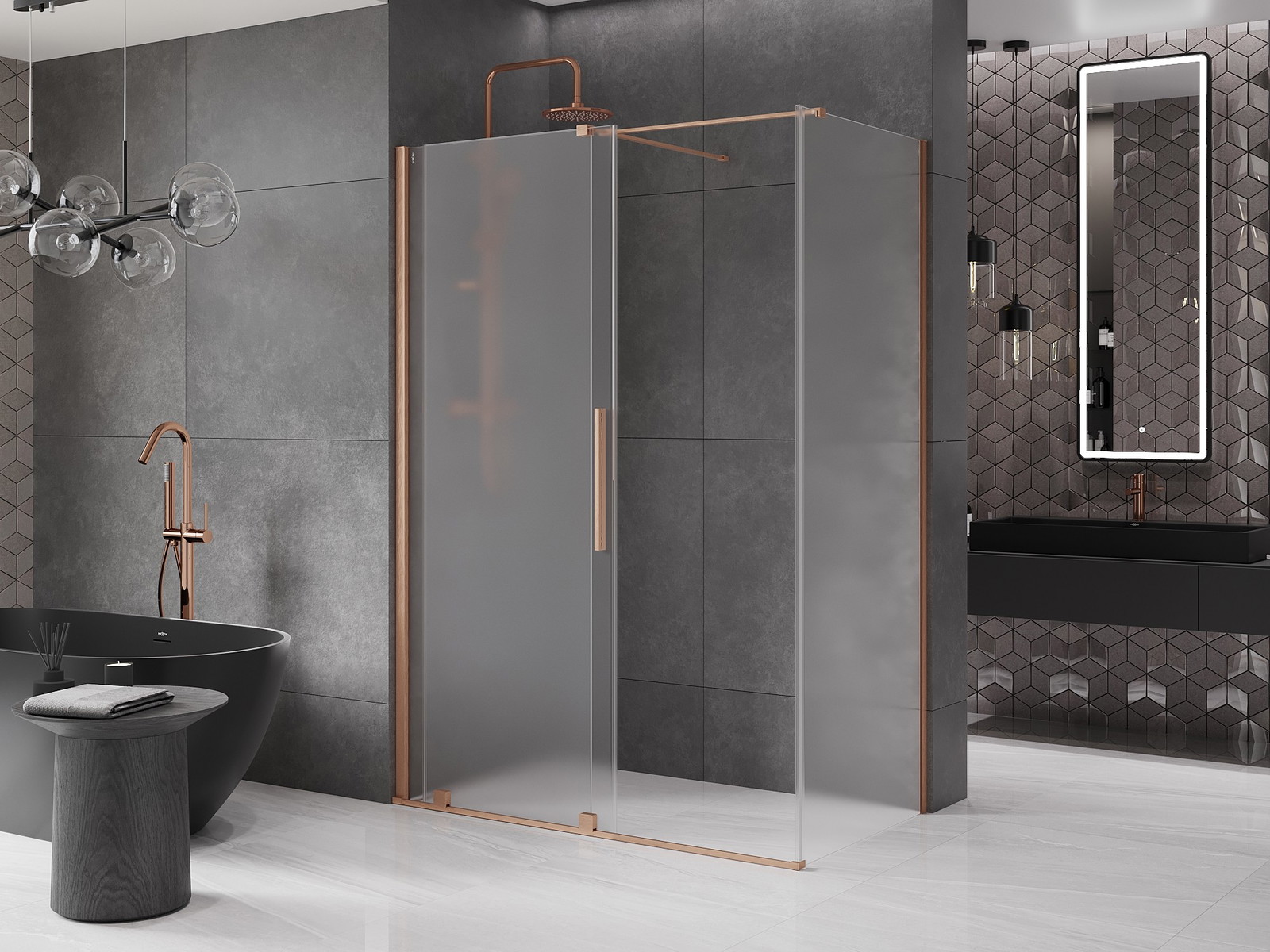 Mexen Velar je elegantna tuš kabina z univerzalno montažo in izjemnim dizajnom. Ima drsna vrata z dimenzijami 160x85 cm in višino 200 cm. Izdelana je iz kaljenega stekla debeline 8 mm v barvi mraza in brušene medenine ter nudi sodoben videz. Aluminijasti profili in edinstvena prevleka za lažje čiščenje povečujejo njeno trajnost. Prilagojena je za montažo na tuš kad ali ploščice, z možnostjo regulacije širine in izravnave neravnin stene. Opremljena je z ročaji iz nerjavečega jekla in aluminijastim pragom za tesnjenje.