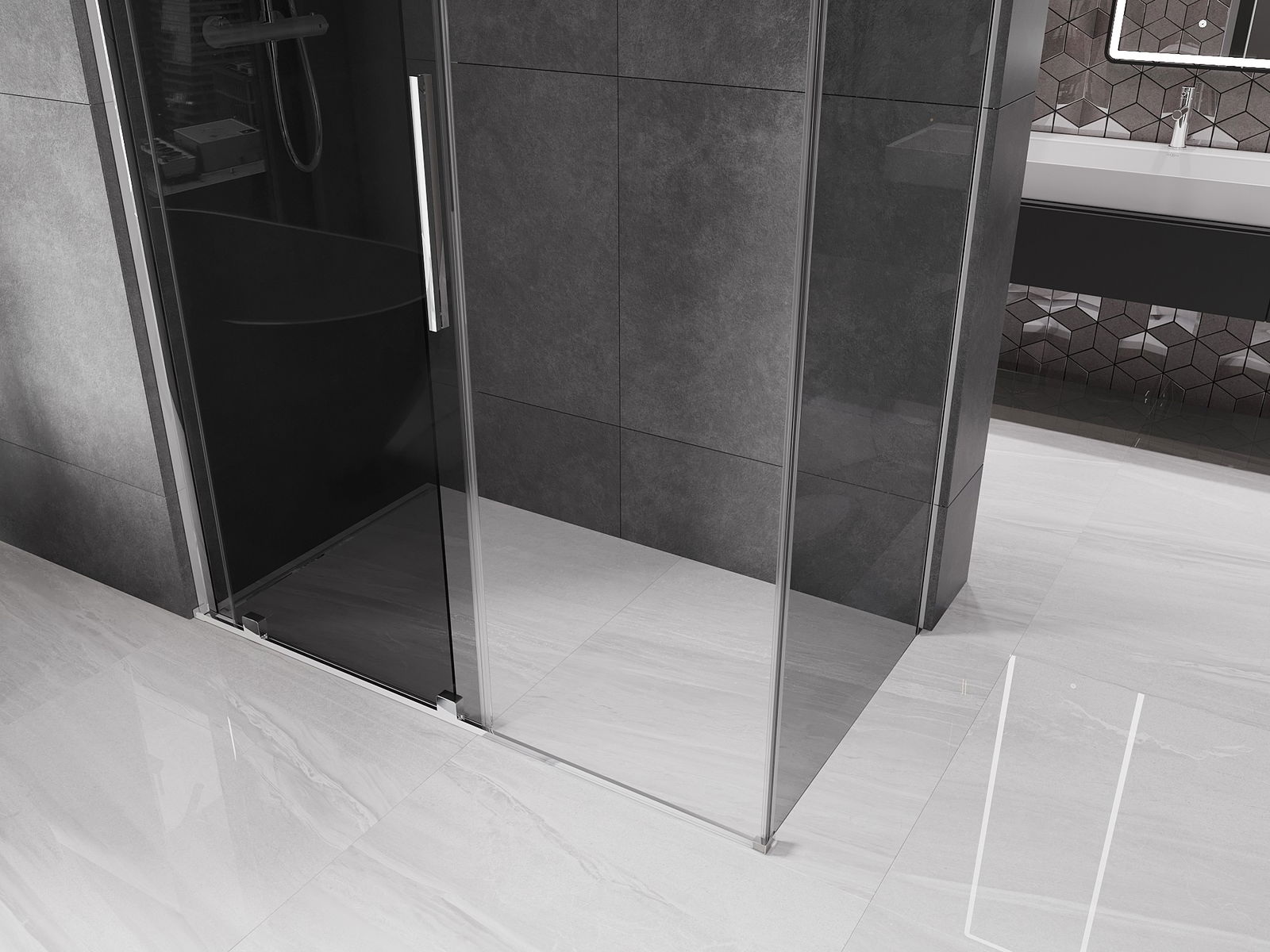 Zahvaljujoč uporabi univerzalnega sistema montaže je mogoče pršne vrata namestiti na desni ali levi strani, odvisno od potreb. Zahvaljujoč temu lahko z lahkoto oblikujete prho, prilagojeno prostoru v kopalnici.