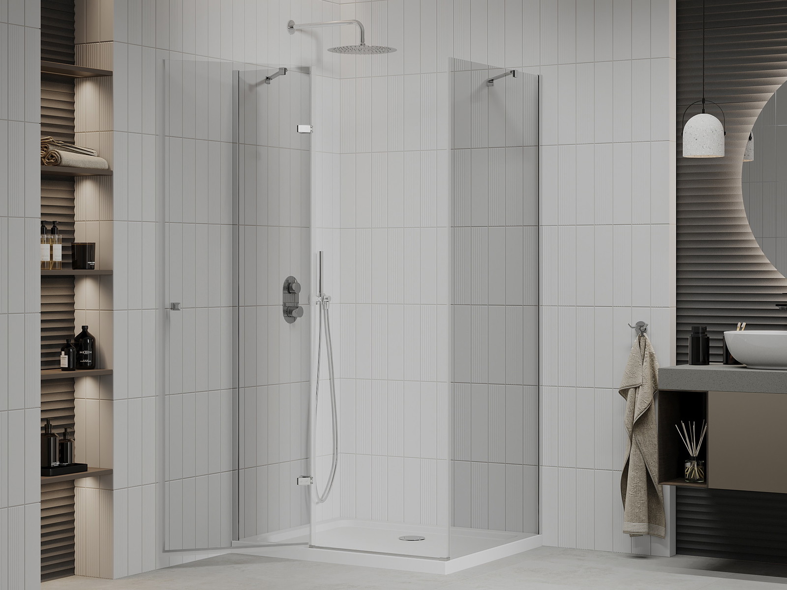 Priročen in udoben ročaj je izdelan iz trpežnega in odpornega kovine. Modna oblika v kombinaciji z zaključkom, ki ustreza barvi profilov, daje celoti sodoben in stilski videz, poudarjajoč estetiko vsake kopalnice.