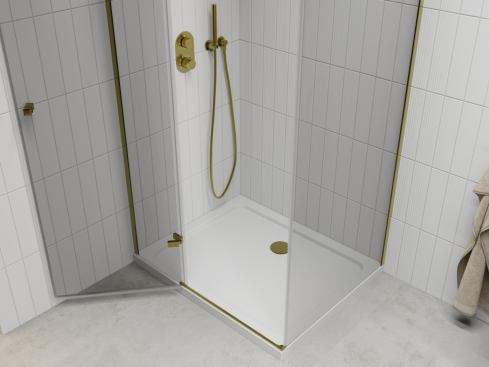 Priročen in udoben ročaj je izdelan iz trpežnega in odpornega kovine. Modna oblika v kombinaciji z zaključkom, ki ustreza barvi profilov, daje celoti sodoben in stilski videz, poudarjajoč estetiko vsake kopalnice.