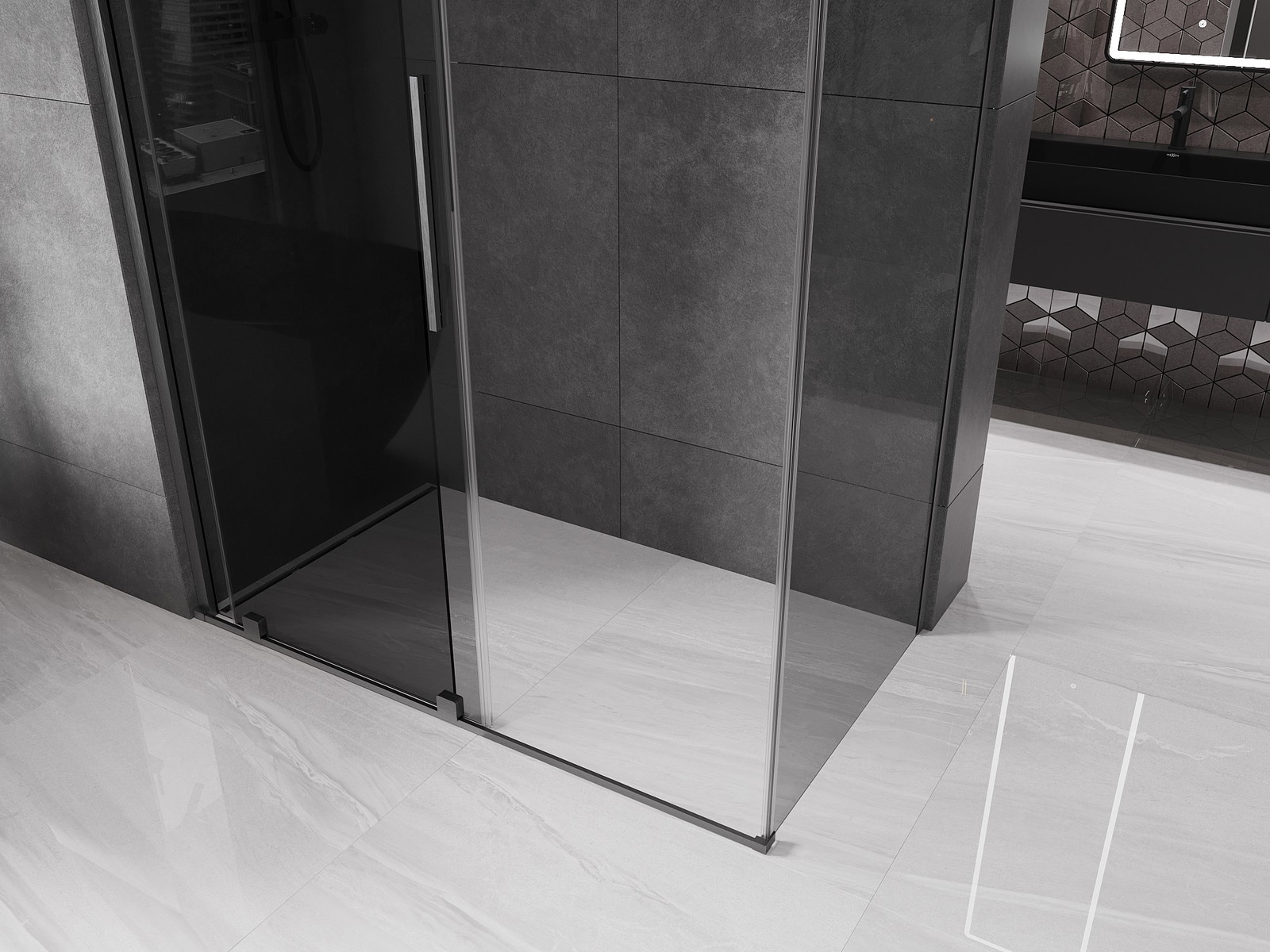 Mexen Velar je elegantna tuš kabina velikosti 160 x 80 cm, idealna za sodobne kopalnice. Zaradi univerzalne montaže in prilagoditve širine jo lahko prilagodite svojim potrebam. Višina 200 cm zagotavlja udobje in prostornost. Grafitno kaljeno steklo debeline 8 mm, zaključeno v pištolsko sivi ščetkani barvi, dodaja stilno podobo. Sistem drsnih vrat, aluminijast profil in ročaj iz nerjavečega jekla zagotavljajo trdnost in funkcionalnost. Premaz za lažje čiščenje in komplet tesnil povečata udobje uporabe, medtem ko visoka kakovost rolerjev zagotavlja gladko delovanje.