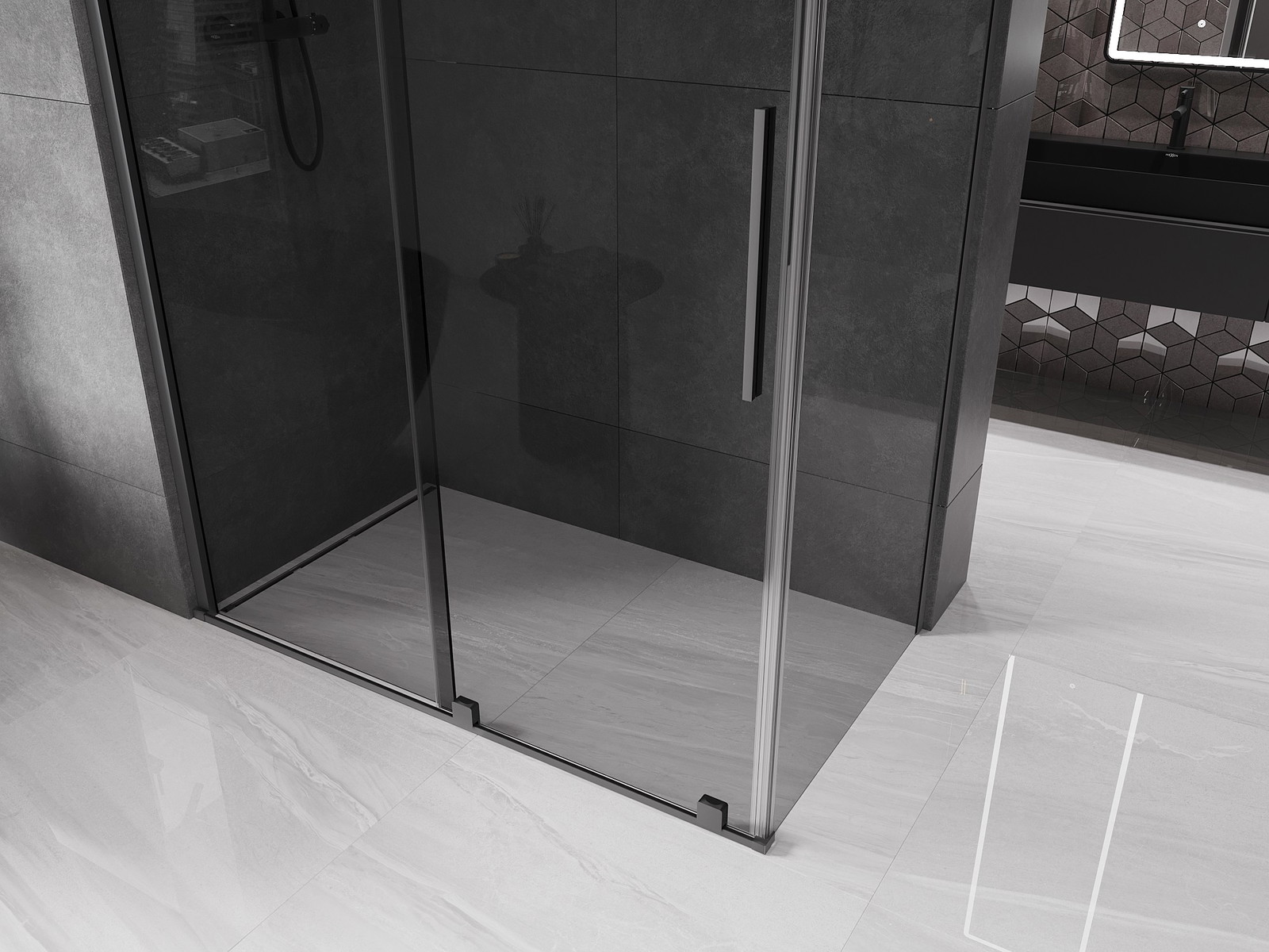 Tuš kabina Mexen Velar dimenzij 150x70 cm je odlična izbira za sodobne kopalnice. Zaradi univerzalne montaže in drsnih vrat se popolnoma prilega različnim prostorom. Grafitno, kaljeno steklo debeline 8 mm z dodatnim premazom za lažje čiščenje zagotavlja trajnost in estetski videz. Zaključek v stilu gun metal, jekleni ročaj in aluminijasti prag za tesnjenje vrat dodajajo eleganco. Sistem nivelacije neenakosti sten ter prilagoditev širine omogočata enostavno montažo tako na kad kot na ploščice.