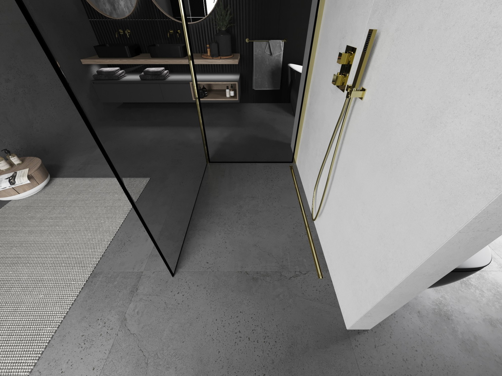 Mexen Kioto tuš stena Walk-in 140 x 110 cm, črn okvir, zlata - 800-140-212-50-70-110