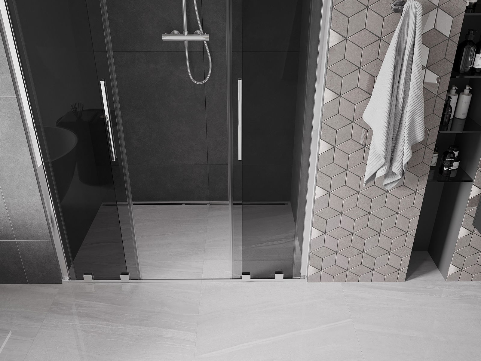 Priročen in udoben ročaj je izdelan iz nerjavečega jekla. Modna oblika v kombinaciji s končno obdelavo, ki ustreza barvi profilov, daje celoti moderen in stiliziran videz ter poudarja estetiko vsake kopalnice.
