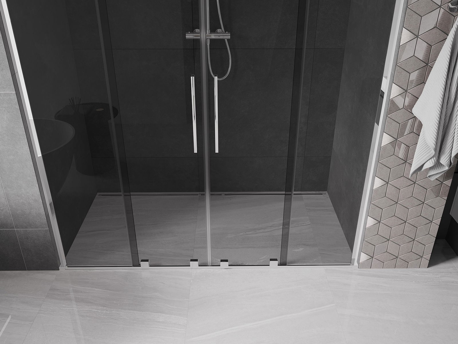 Priročen in udoben ročaj je izdelan iz nerjavečega jekla. Modna oblika v kombinaciji s končno obdelavo, ki ustreza barvi profilov, daje celoti moderen in stiliziran videz ter poudarja estetiko vsake kopalnice.