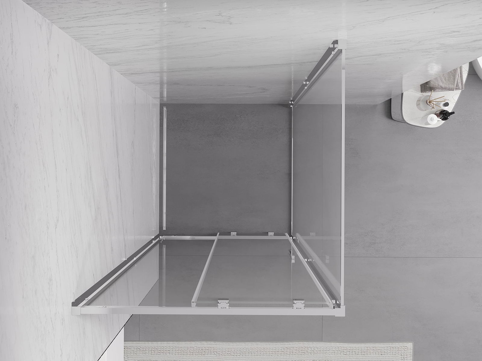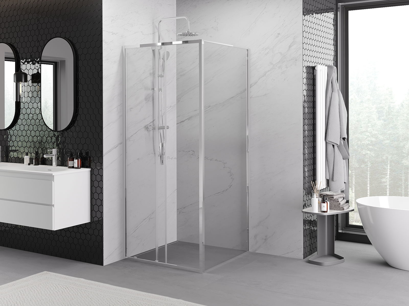 Priročen in udoben ročaj je izdelan iz trpežnega in odpornega kovine. Modna oblika v kombinaciji z zaključkom, ki ustreza barvi profilov, daje celoti sodoben in stilski videz, poudarjajoč estetiko vsake kopalnice.