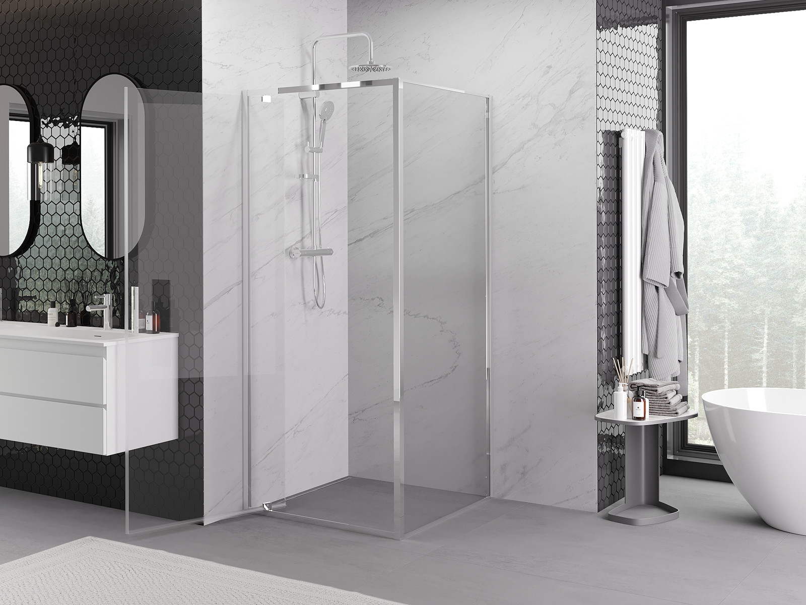 Mexen Exo je elegantna tuš kabina dimenzij 80x80 cm, ki združuje stil in funkcionalnost. Višina 200 cm in nagibna vrata omogočajo udobno uporabo. Prozorno, kaljeno steklo debeline 6 mm zagotavlja sodoben videz in varnost. Kromirana končna obdelava in aluminijasti profil dodajata sodoben pridih. Kabina ima premaz za lažje čiščenje, možnost nivelacije neenakosti stene ter prilagajanje širine, kar jo naredi univerzalno rešitev za vsako kopalnico.