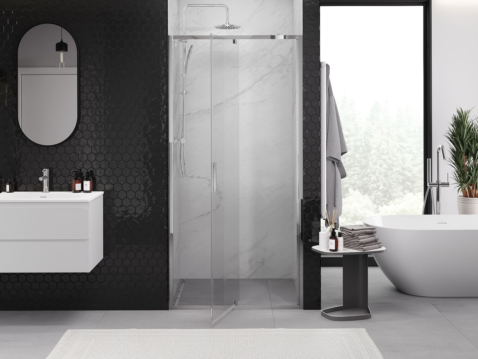 Priročen in udoben ročaj je izdelan iz trpežnega in odpornega kovine. Modna oblika v kombinaciji z zaključkom, ki ustreza barvi profilov, daje celoti sodoben in stilski videz, poudarjajoč estetiko vsake kopalnice.