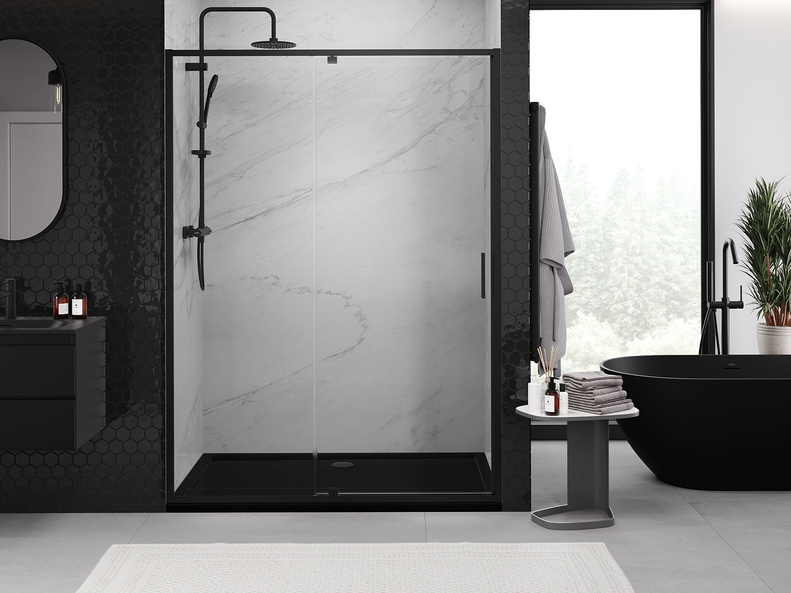 Priročen in udoben ročaj je izdelan iz trpežnega in odpornega kovine. Modna oblika v kombinaciji z zaključkom, ki ustreza barvi profilov, daje celoti sodoben in stilski videz, poudarjajoč estetiko vsake kopalnice.