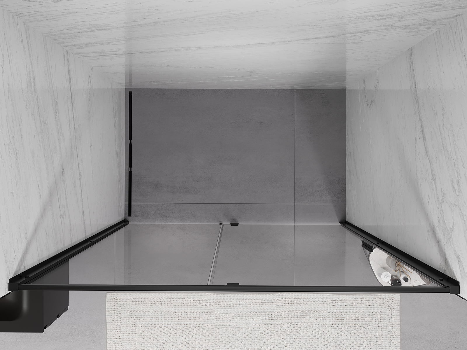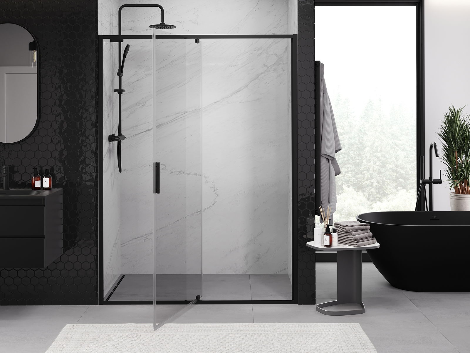 Priročen in udoben ročaj je izdelan iz trpežnega in odpornega kovine. Modna oblika v kombinaciji z zaključkom, ki ustreza barvi profilov, daje celoti sodoben in stilski videz, poudarjajoč estetiko vsake kopalnice.