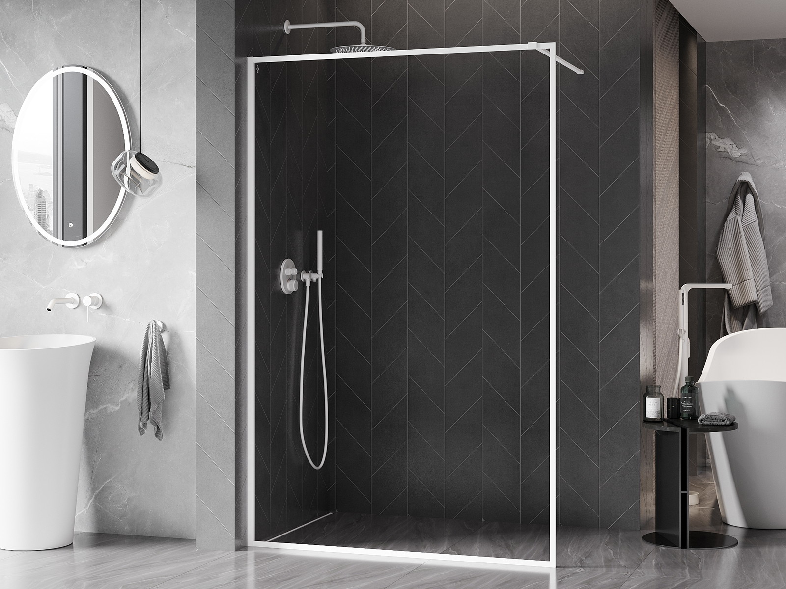 Prhašna stena Mexen Kioto-F je sodobna in funkcionalna rešitev za vsako kopalnico. S širino 160 cm in višino 202 cm nudi univerzalno montažo tako na desni kot levi strani. Zahvaljujoč prozornemu, kaljenemu steklu debeline 8 mm prostor ostaja svetel in prostoren. Beli aluminijasti profil in okvir zagotavljata elegantno zaključek, jekleni podpornik pa trajnost do 150 cm. Dodatno, možnost prilagoditve podpornika ter enostaven za čiščenje premaz in nivelacija neravnin stene delajo ta izdelek edinstven.
