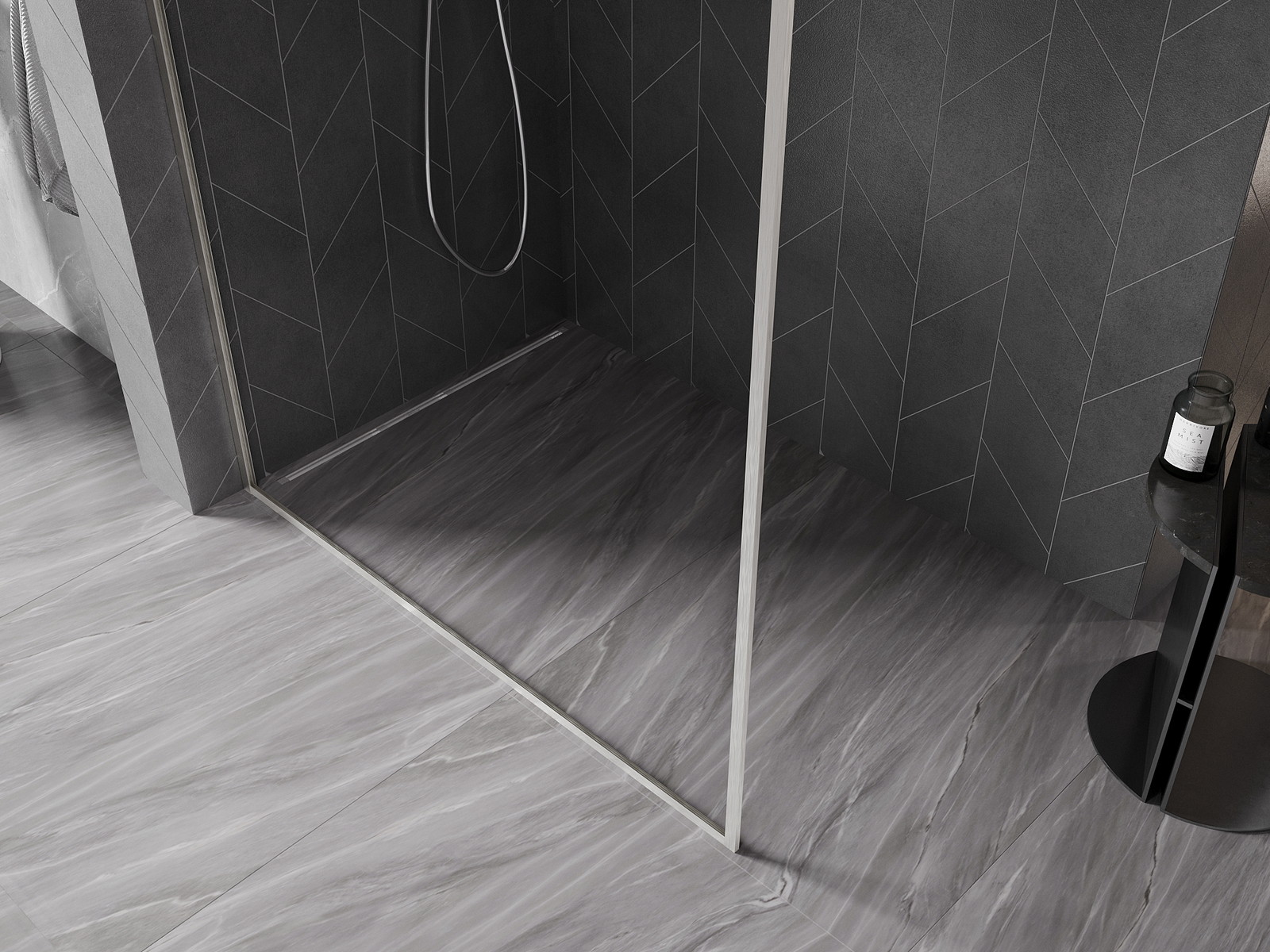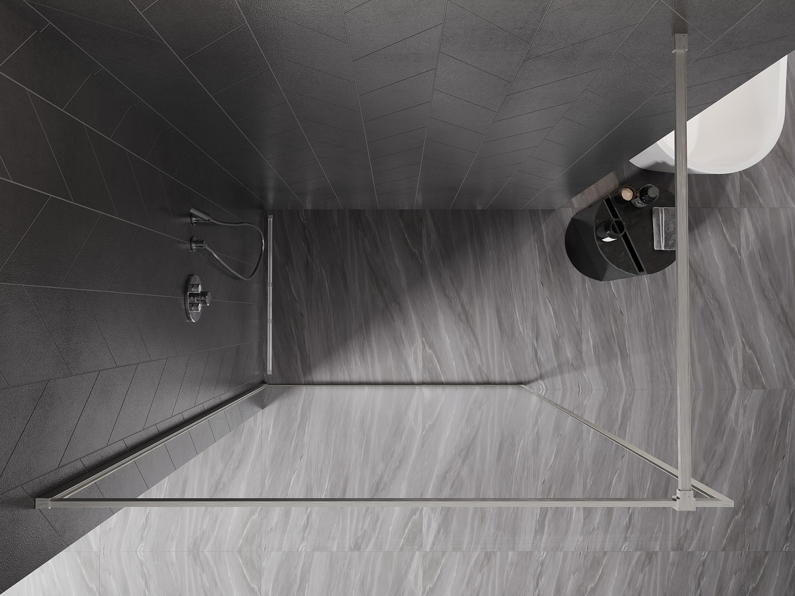 Mexen Kioto-F je elegantna tuš stena Walk-in dimenzij 160 x 202 cm, ki se ponaša z modernim dizajnom in funkcionalnostjo. Prozorno kaljeno steklo debeline 8 mm zagotavlja trdnost in varnost, brušen nikelj pa estetski videz. Univerzalna montaža na desni ali levi strani se prilagodi vsaki kopalnici. Aluminijast okvir in nosilec iz nerjavečega jekla zagotavljata stabilnost, premaz za lažje čiščenje ter možnost izravnave neravnosti stene pa dodajata praktičnost.