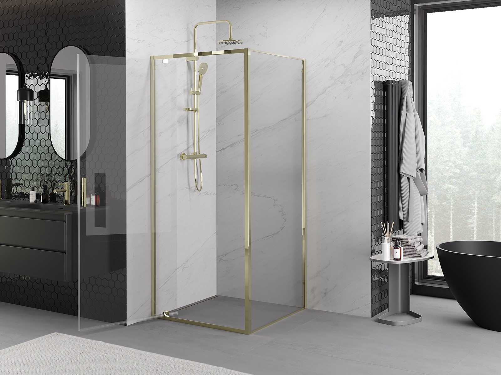 Priročen in udoben ročaj je izdelan iz trpežnega in odpornega kovine. Modna oblika v kombinaciji z zaključkom, ki ustreza barvi profilov, daje celoti sodoben in stilski videz, poudarjajoč estetiko vsake kopalnice.