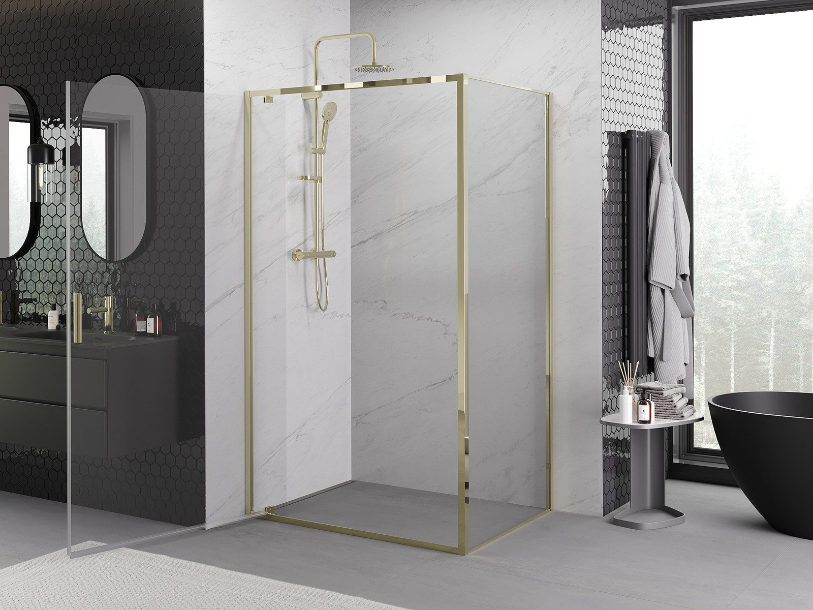 Tuš kabina Mexen Exo je elegantna izbira za vašo kopalnico. Njena moderna zasnova je poudarjena z zlatim zaključkom in prozornim, kaljenim steklom debeline 6 mm. Velikost 100x75 cm z vrati s krilnimi vrati zagotavlja udobje uporabe, višina 200 cm pa zagotavlja udobje. Poseben premaz olajša čiščenje, aluminijast profil in kovinski ročaj pa ji dodajata trajnost. Univerzalna montaža, širinska prilagoditev in komplet tesnil za odvajanje vode so dodatne prednosti te kabine.