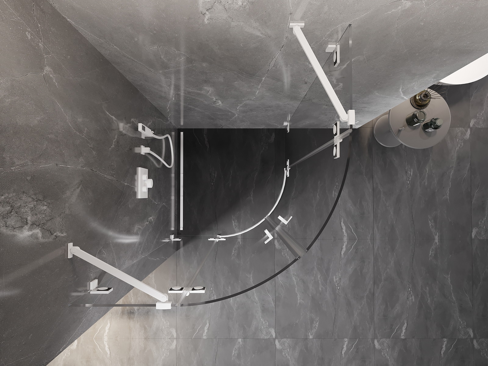 Priročen in udoben ročaj je izdelan iz trpežnega in odpornega kovine. Modna oblika v kombinaciji z zaključkom, ki ustreza barvi profilov, daje celoti sodoben in stilski videz, poudarjajoč estetiko vsake kopalnice.