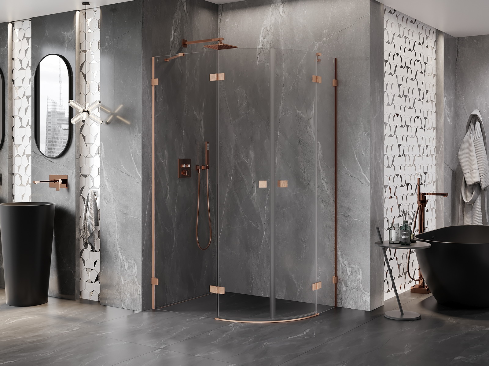 Priročen in udoben ročaj je izdelan iz trpežnega in odpornega kovine. Modna oblika v kombinaciji z zaključkom, ki ustreza barvi profilov, daje celoti sodoben in stilski videz, poudarjajoč estetiko vsake kopalnice.